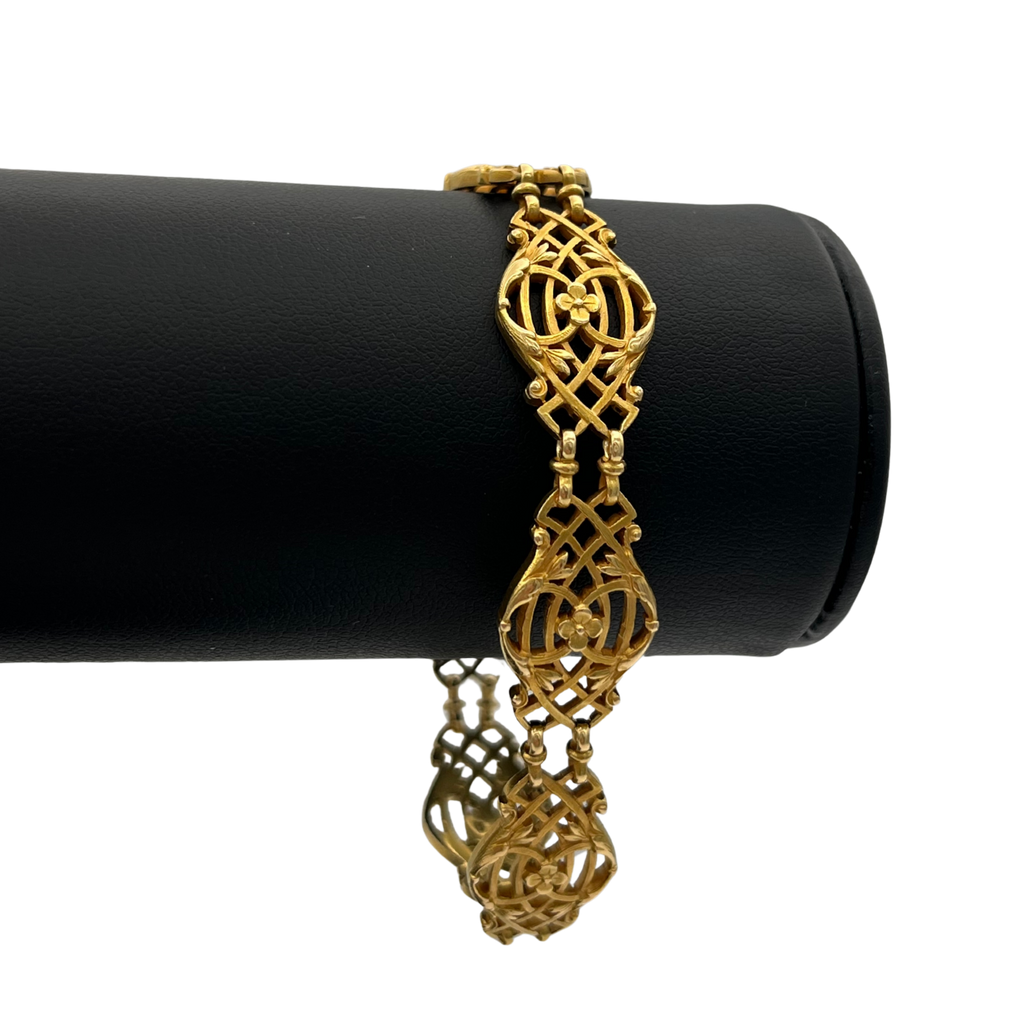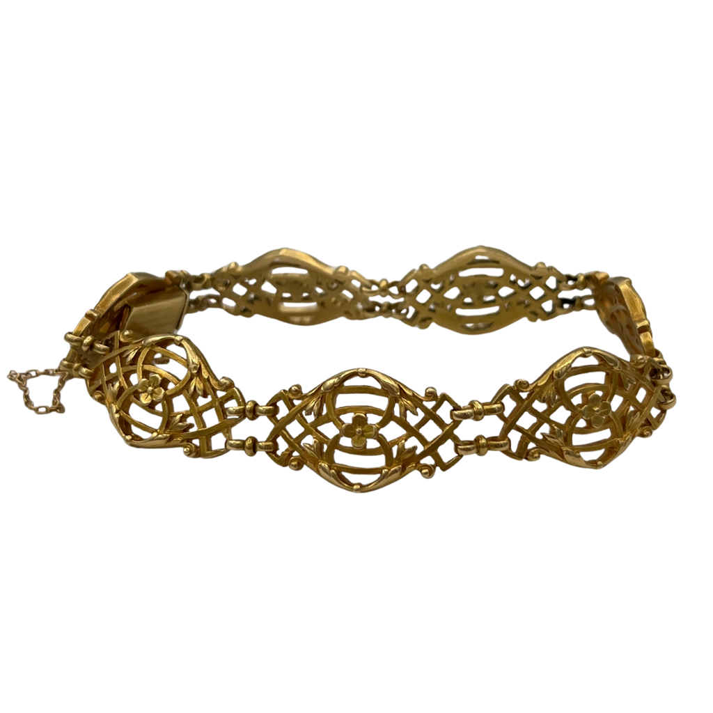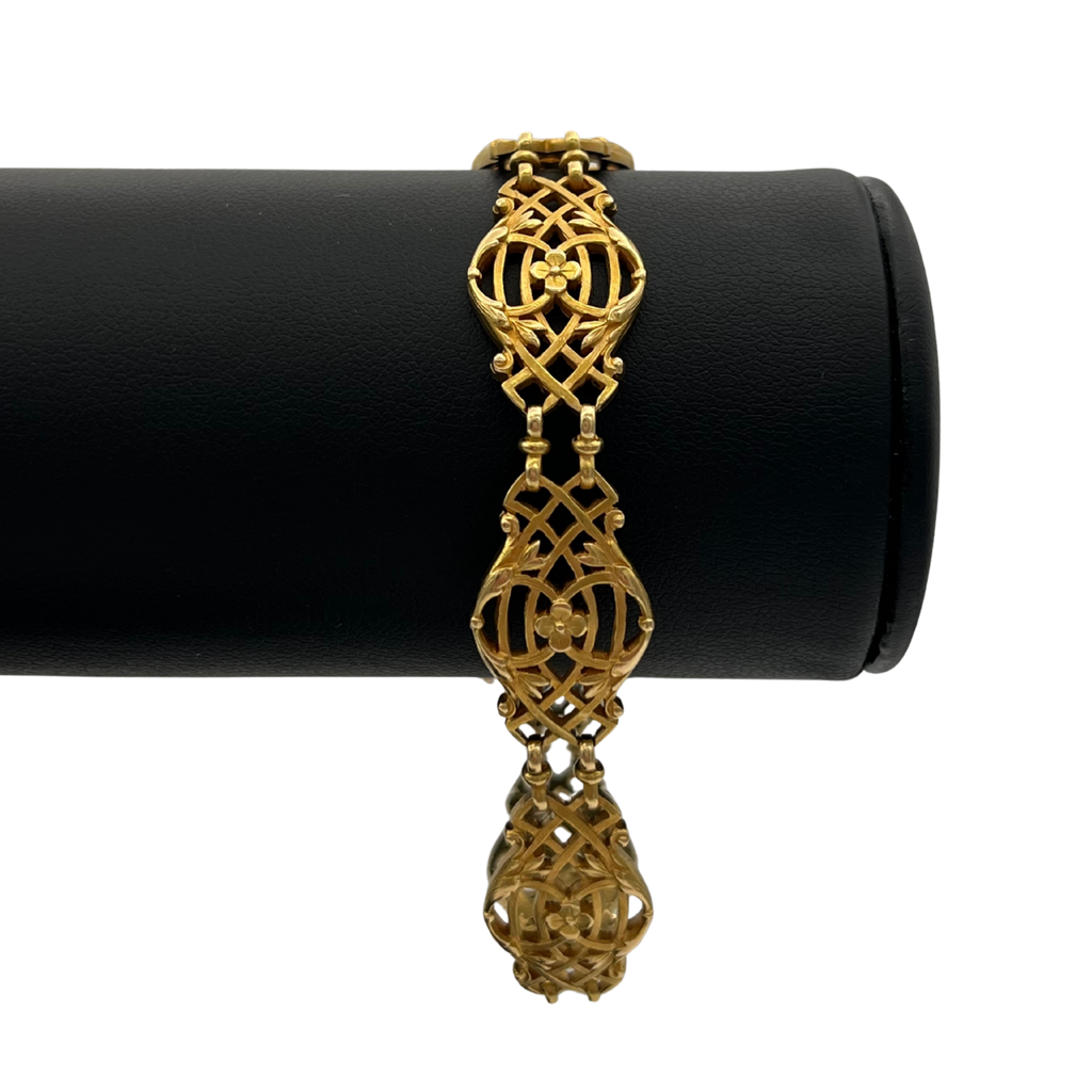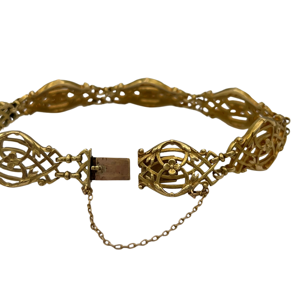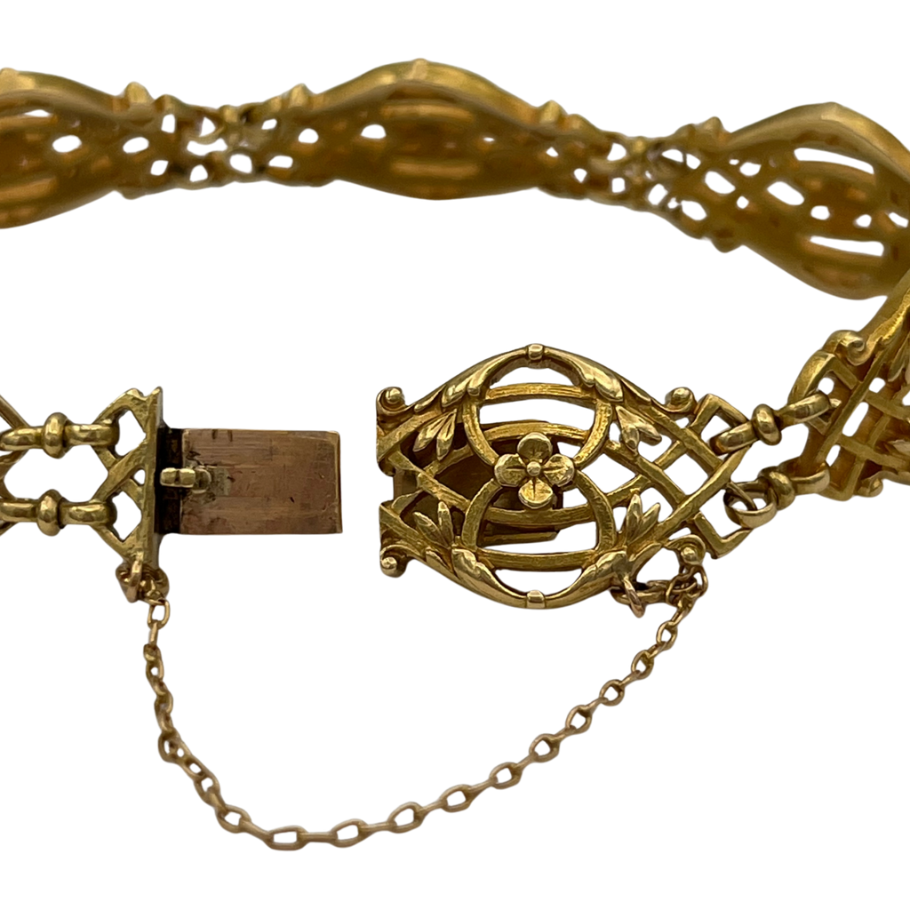 Lovely antique French Art Nouveau 18k yellow gold bracelet with a gorgeous patina that is only achievable with age. The continuous foliate and floral motif makes this stunning piece unmistakably Art Nouveau (1890-1910). The bracelet features a push clasp and safety chain.