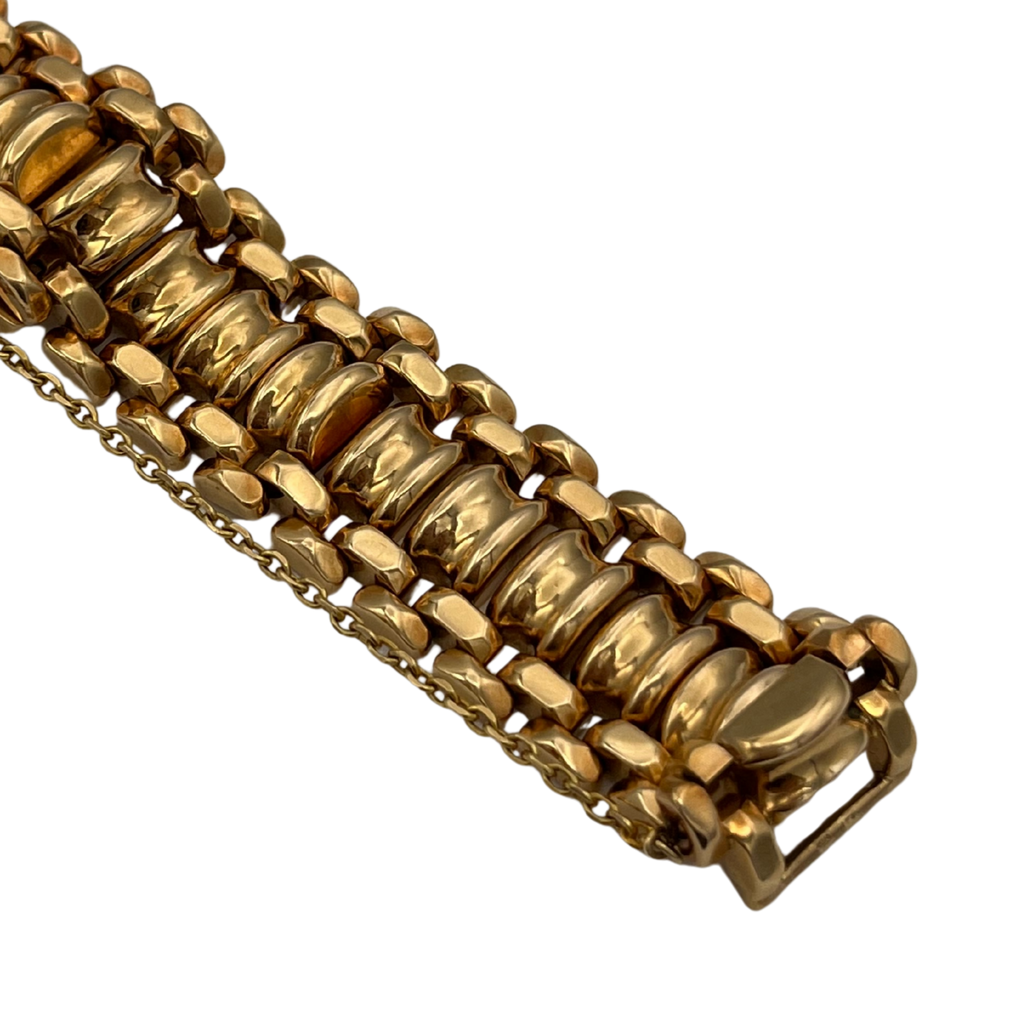 Vintage heavy hollow 18k rose gold link bracelet with a matching link hinged lock and 2 1/4 inch safety chain.