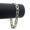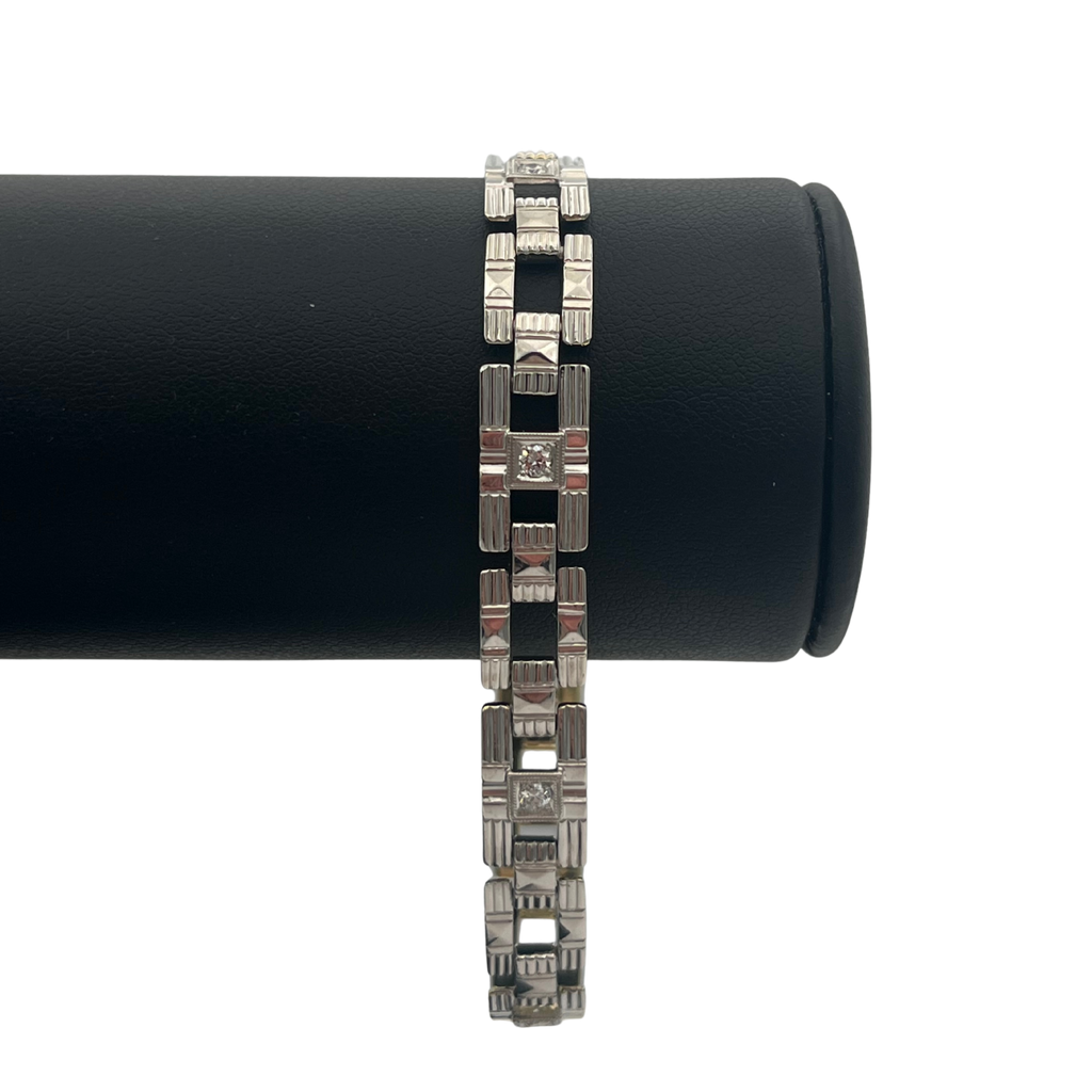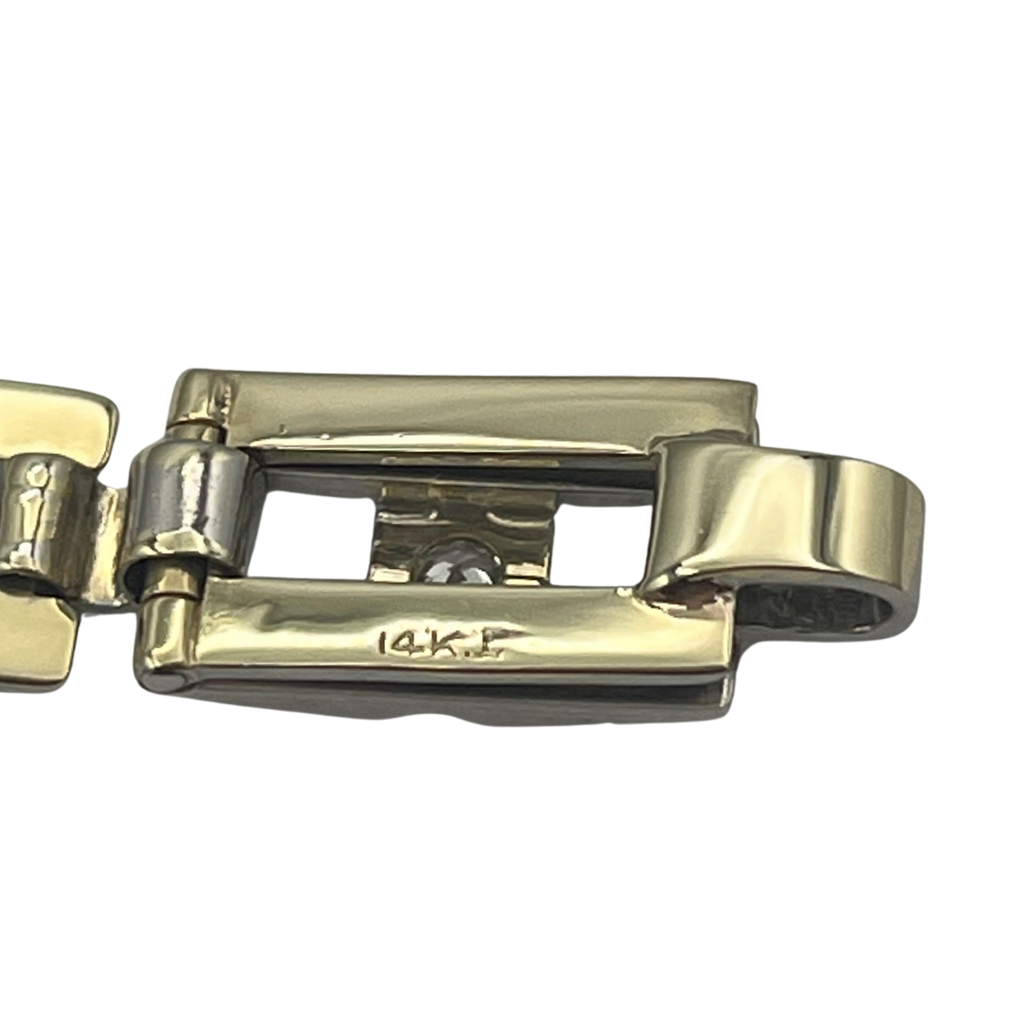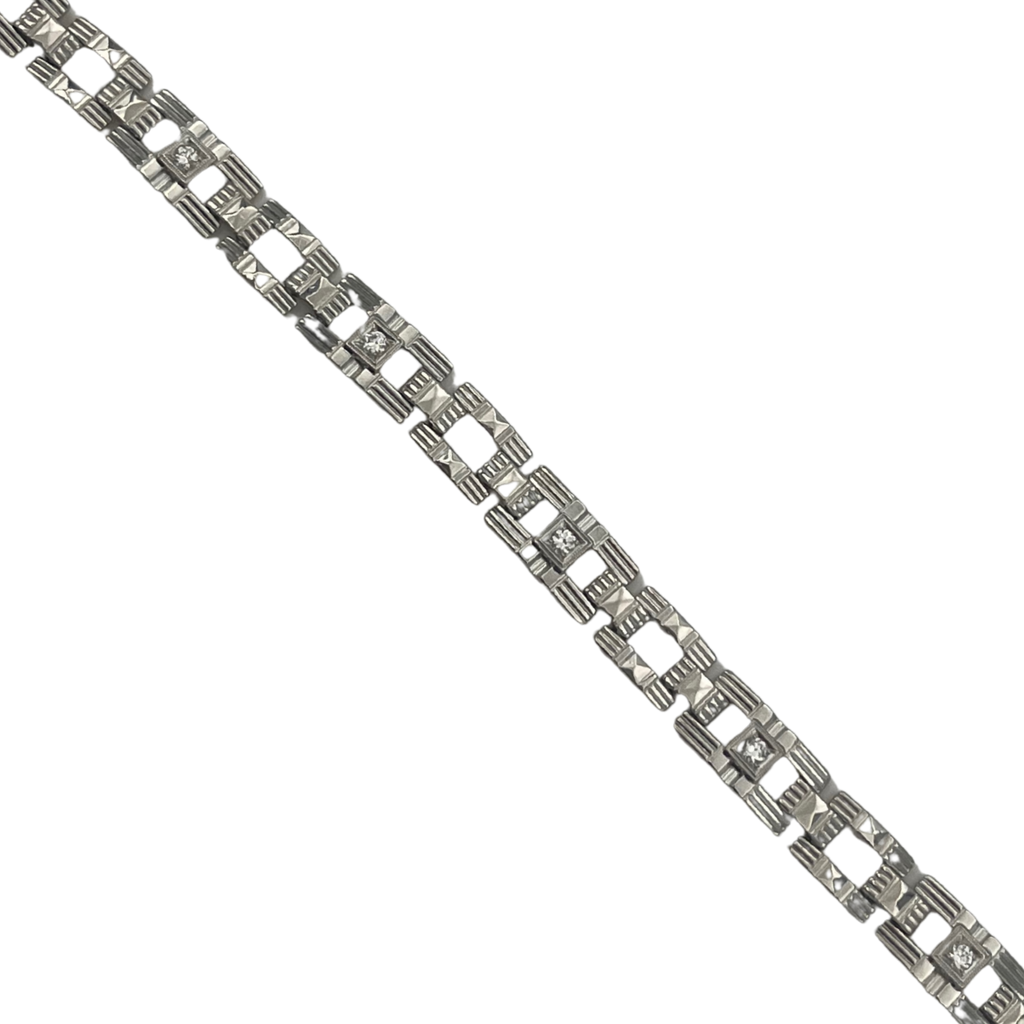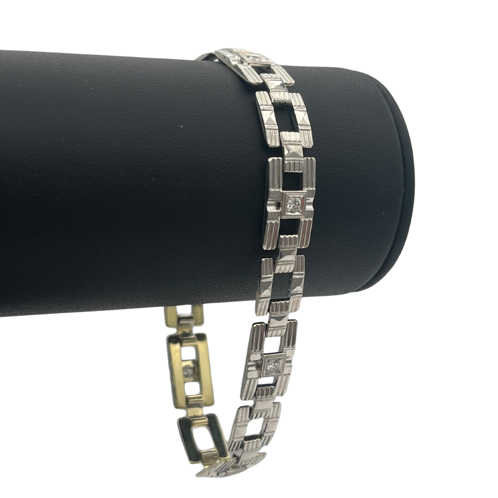 Vintage "Art Deco" white & yellow 14k gold link bracelet featuring a geometric motif, with "millegrain" detailing around pave set transitional cut diamonds- Invisible clasp attached. This bracelet is hand made, with the top white gold sections of the bracelet fused to the bottom sections of yellow gold.  -Fine make.