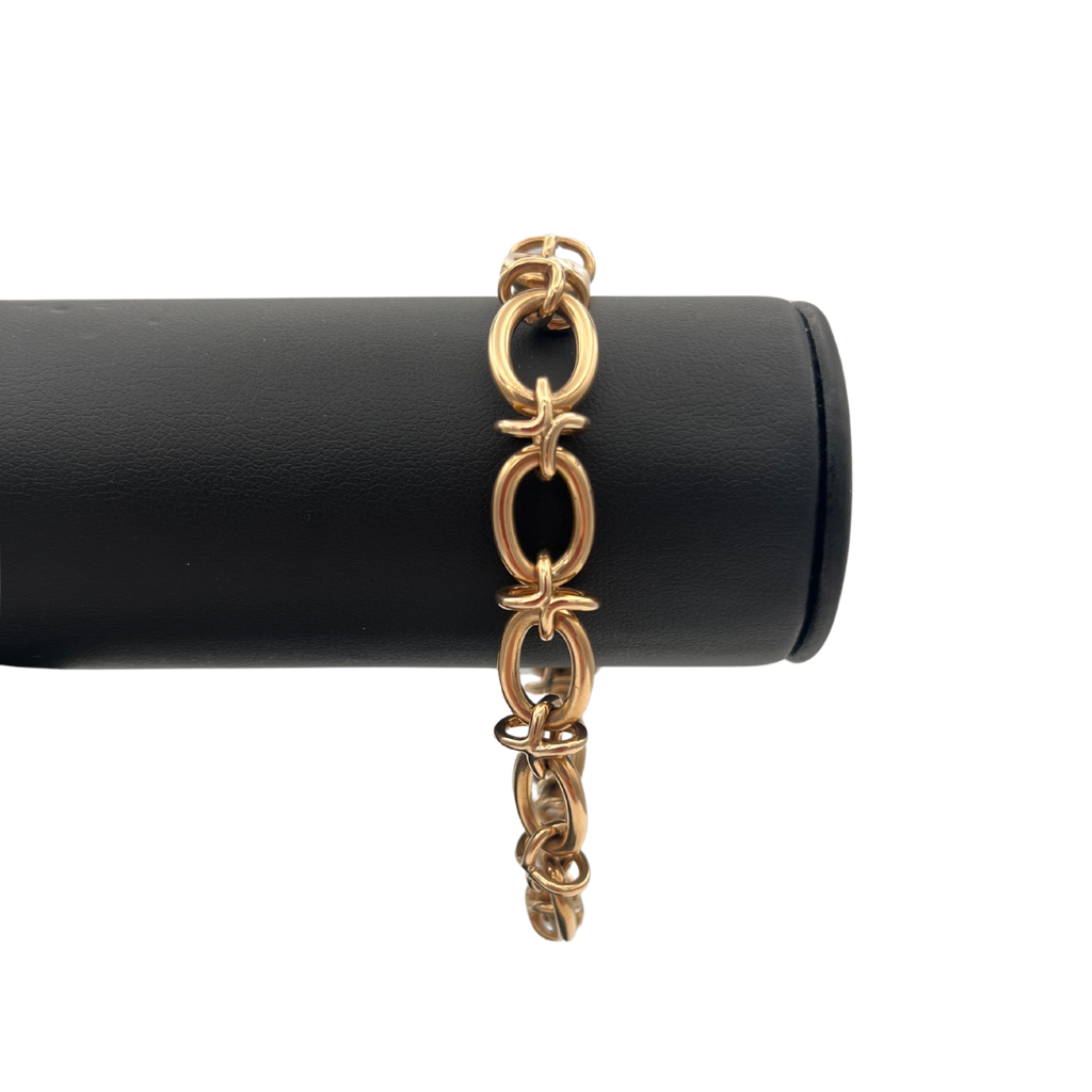 A Beautiful design of ovals and x's make up this solid 14k gold bracelet. The bracelet opens with a large spring ring and has an extra security chain.