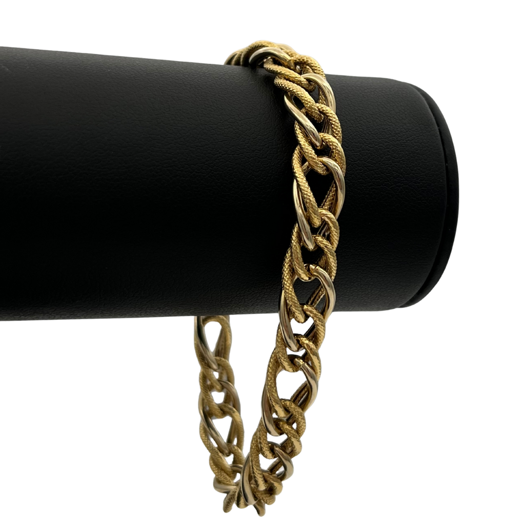 llow gold braided link bracelet with contrasting high polish and cross-hatched finish links. Fastens with a fancy large lobster clasp.