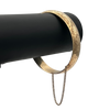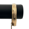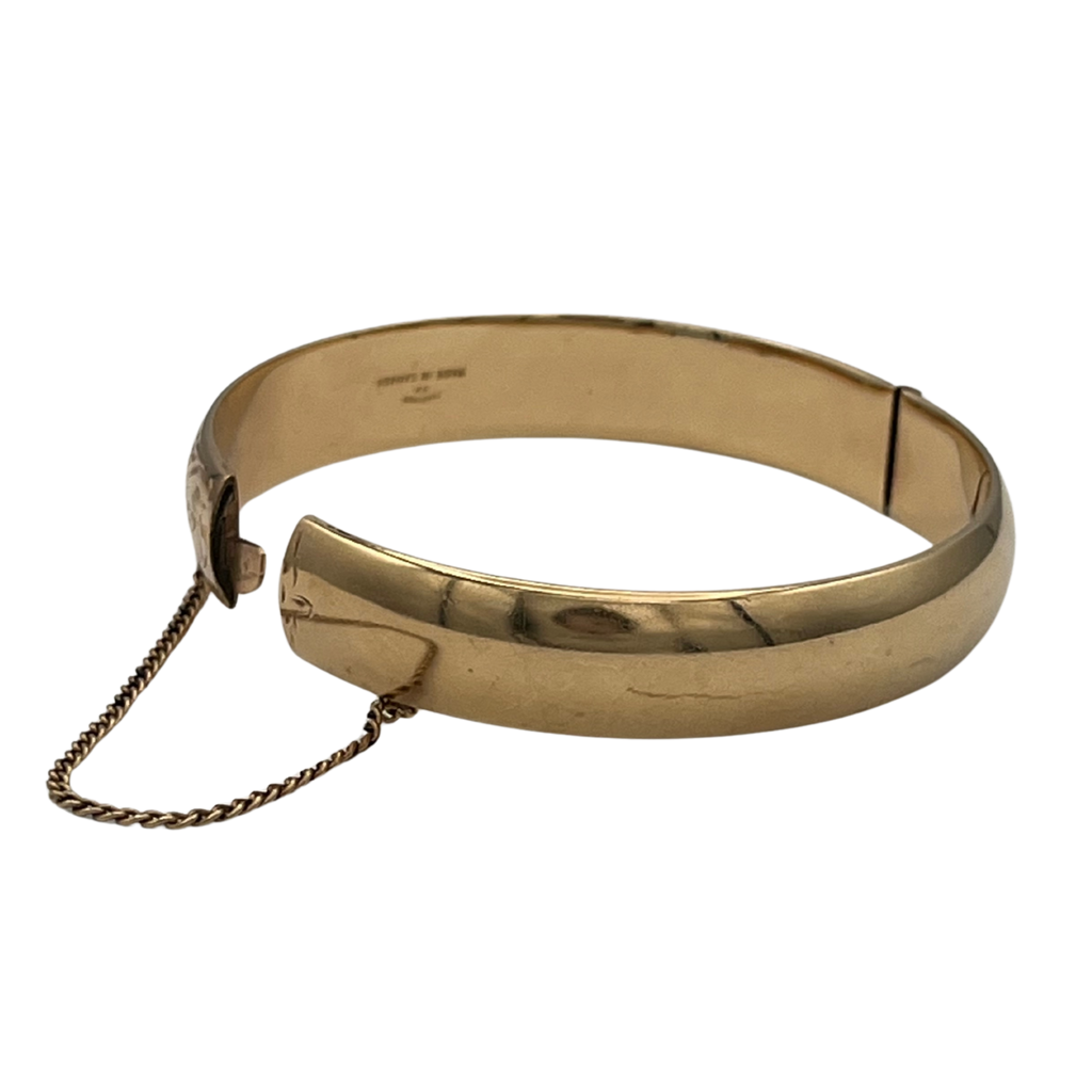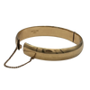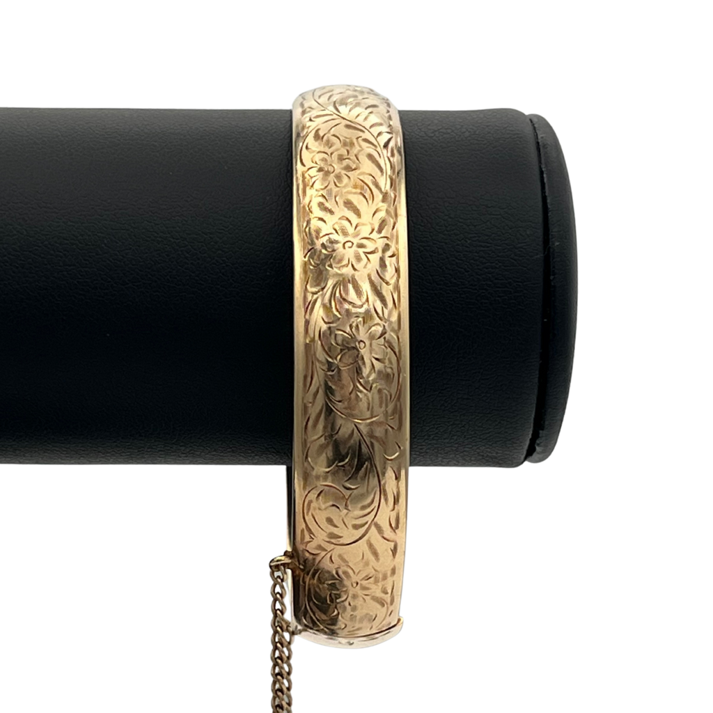 Vintage 10k yellow gold hinged bangle bracelet hand engraved with a flower and vine motif. The bracelet fastens with a push clasp and has a safety chain.