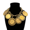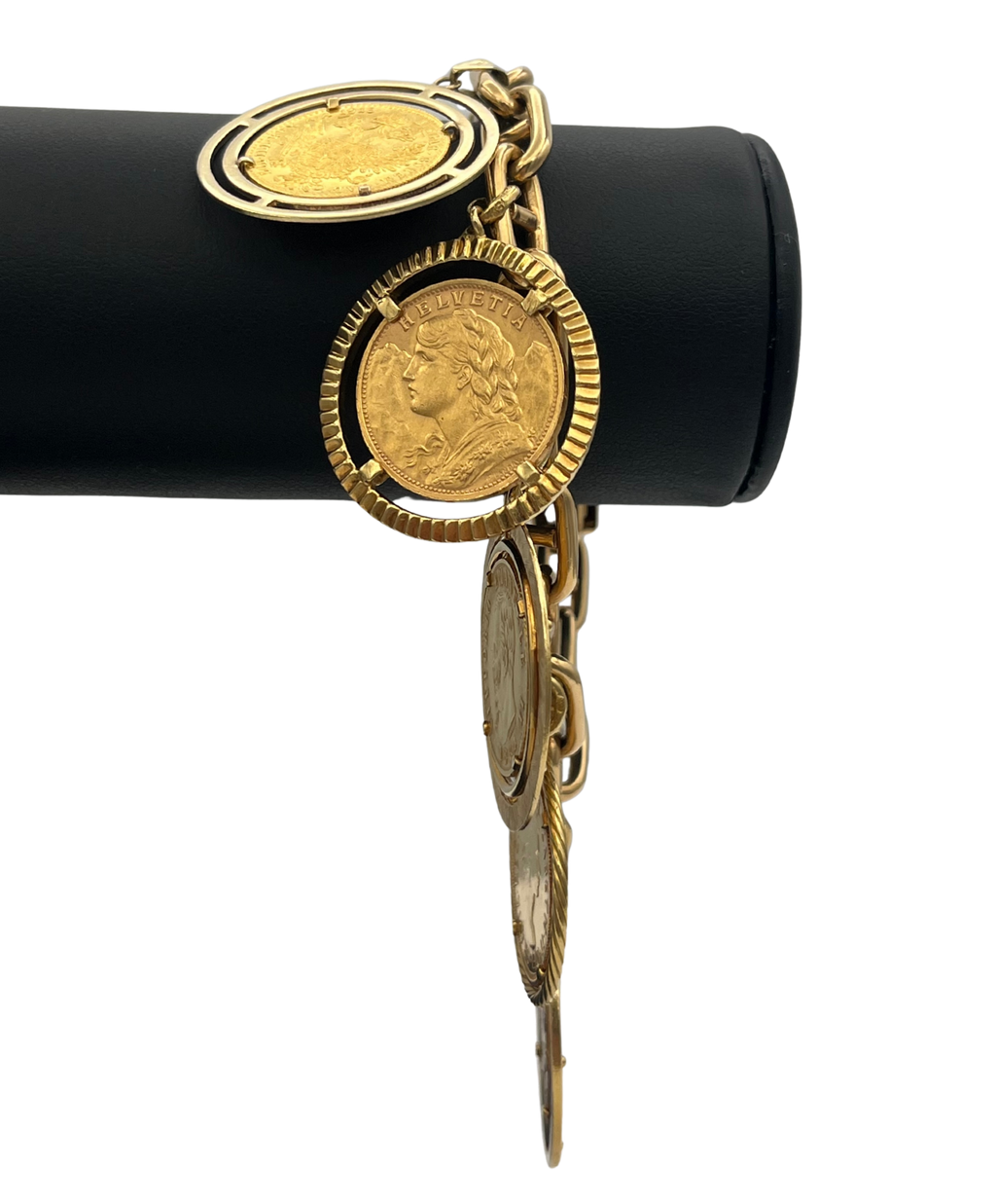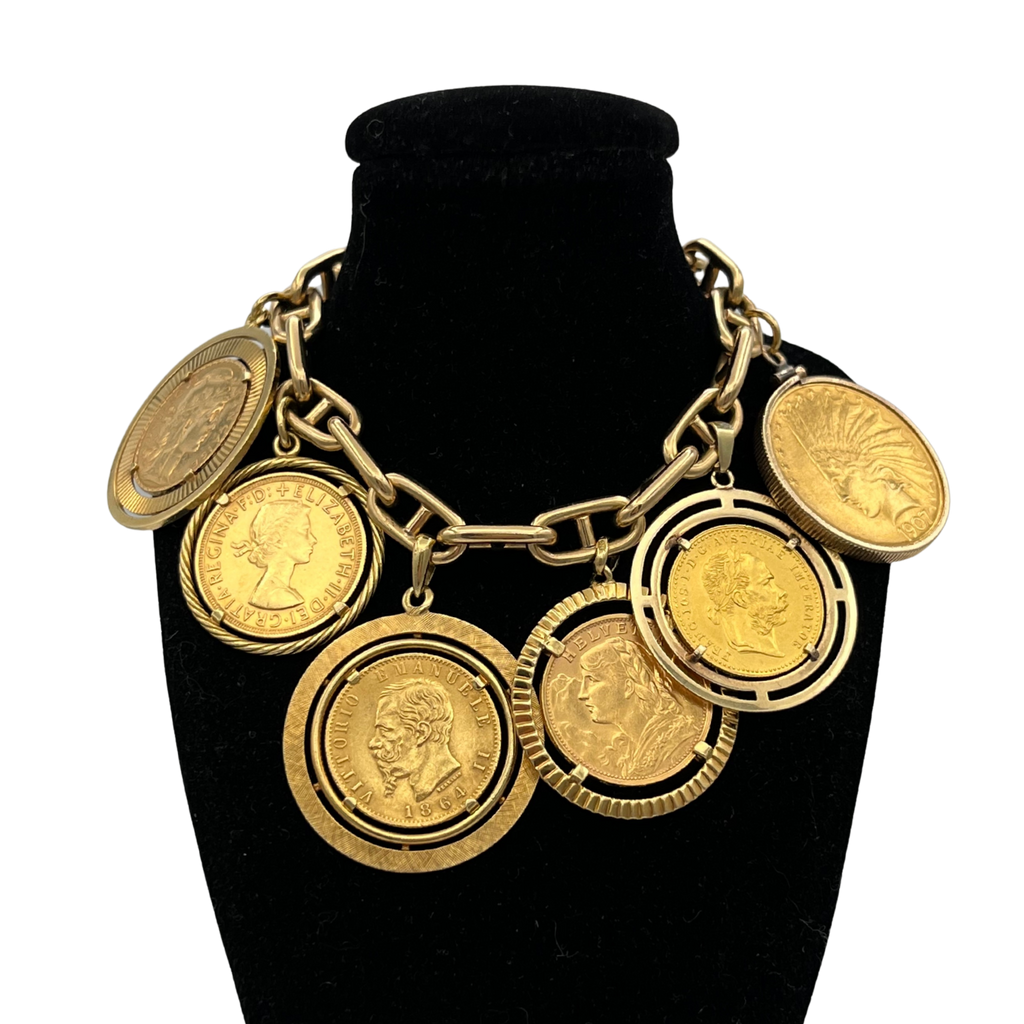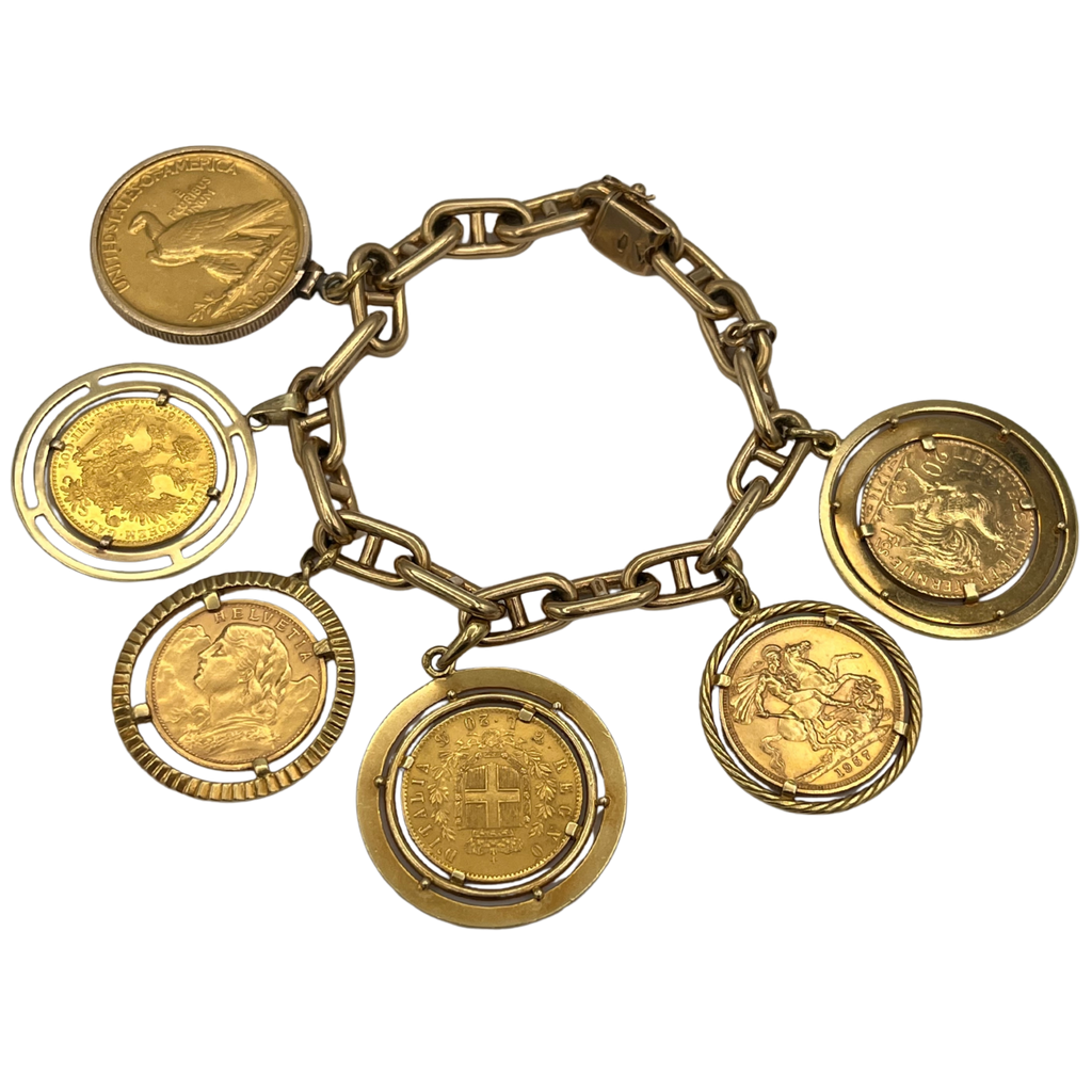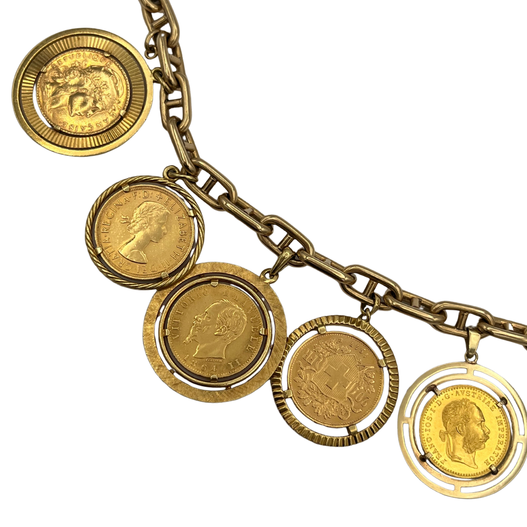 Vintage 18k yellow gold anchor chain charm bracelet with six individually set gold coins.