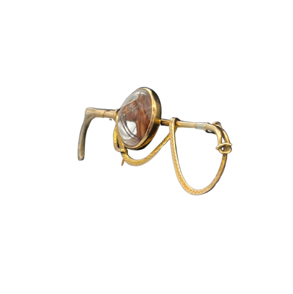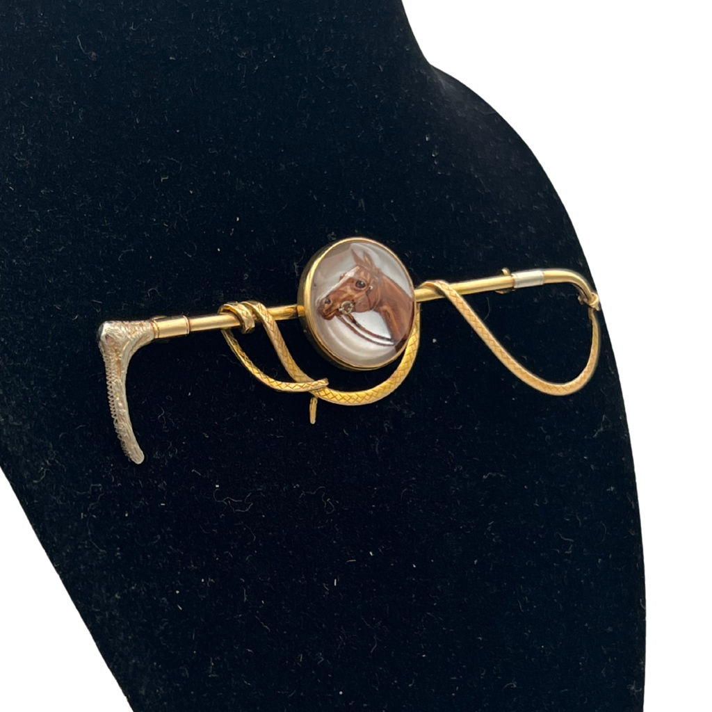 A stunning example of reverse intaglio painted crystal. These pieces became quite popular in the late Victorian era and required great skill to both carve and paint with minute details. This particular piece also has exceptional detail in the whip itself with different engravings demarking the handle (white gold) and leather whip.