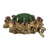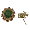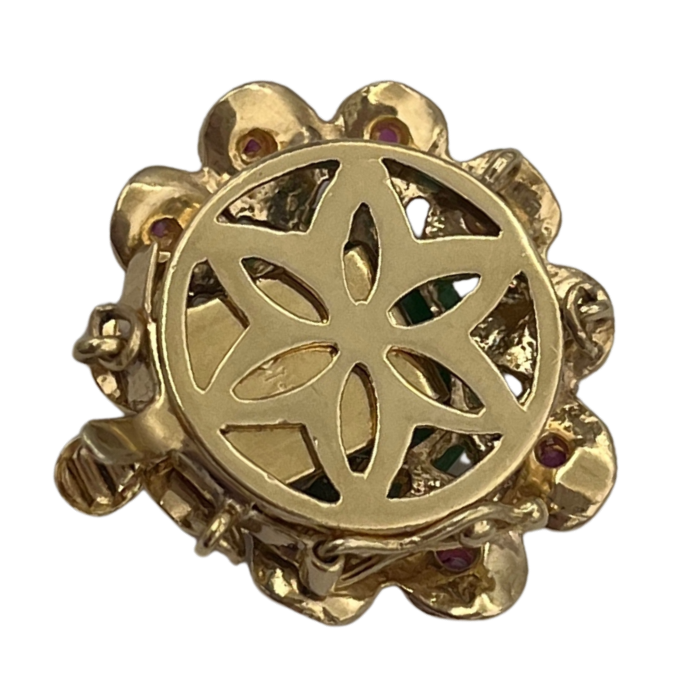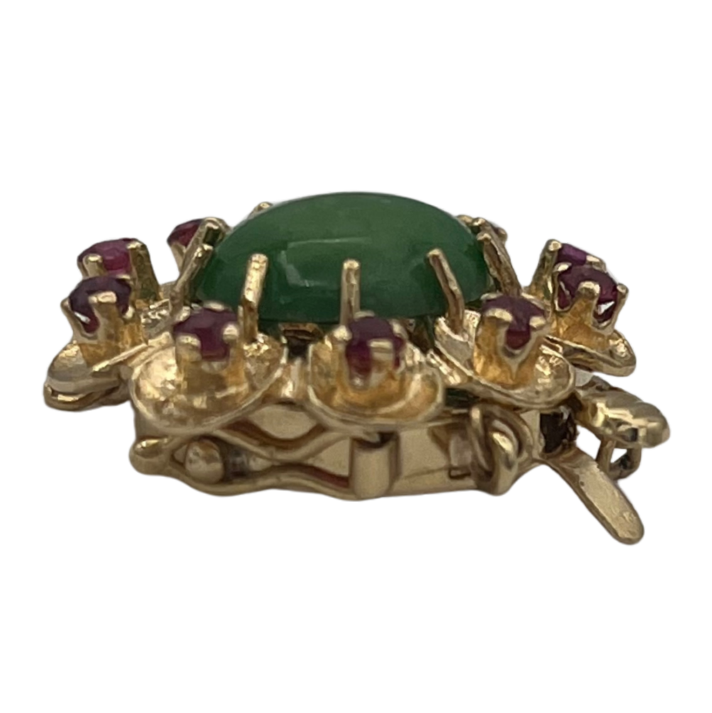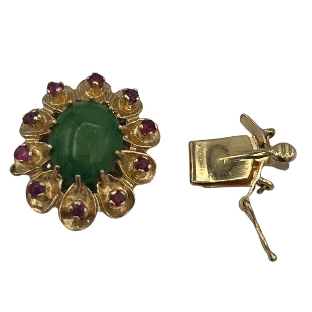 Vintage retro flower-shaped two-strand push clasp centered with a cabochon cut jadeite jade stone, and rubies on each of the petals. The clasp has one figure-eight safety lock.