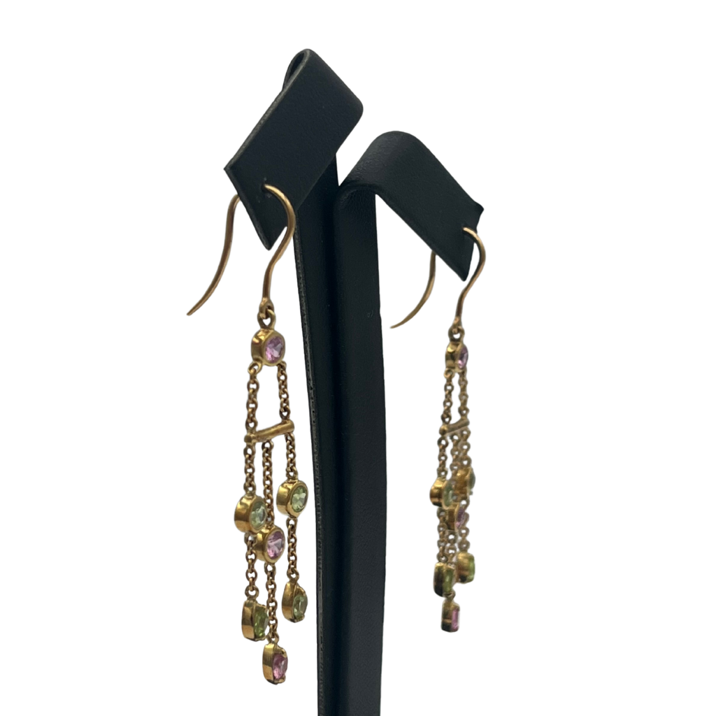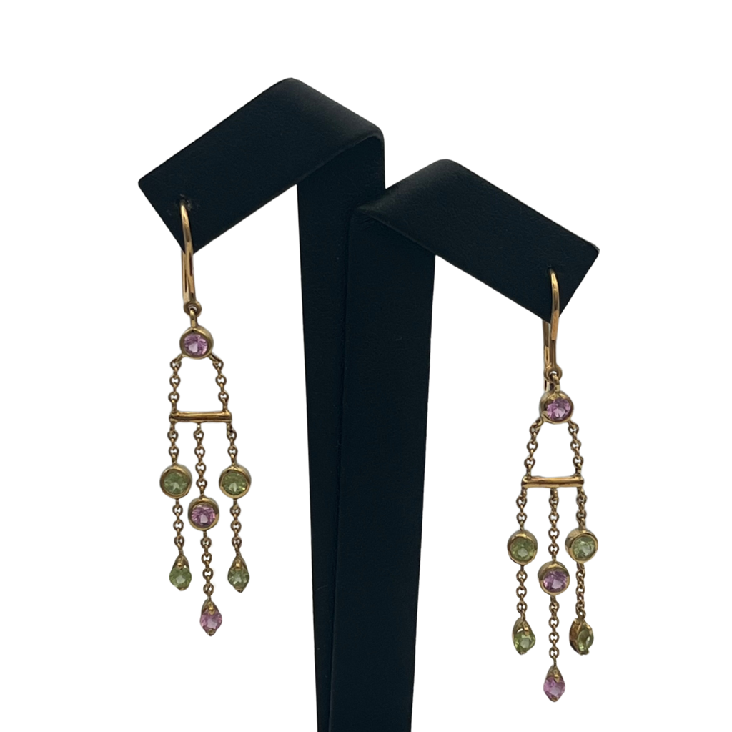 Lovely vintage Tiffany & Co. 18k yellow gold chandelier earrings with pink sapphires and peridot stones set on lengths of 1.3mm chain.