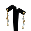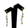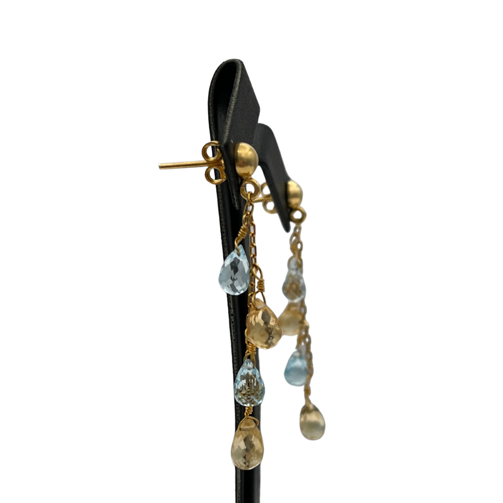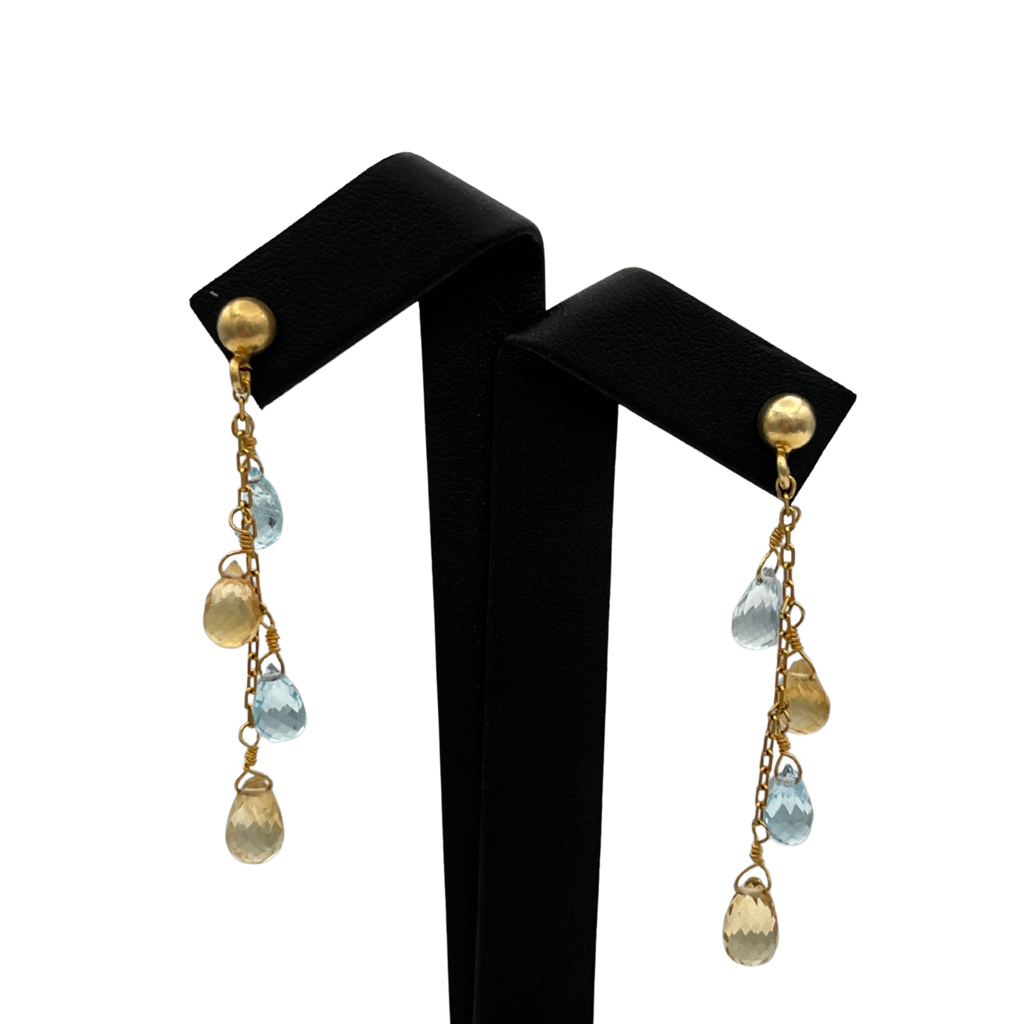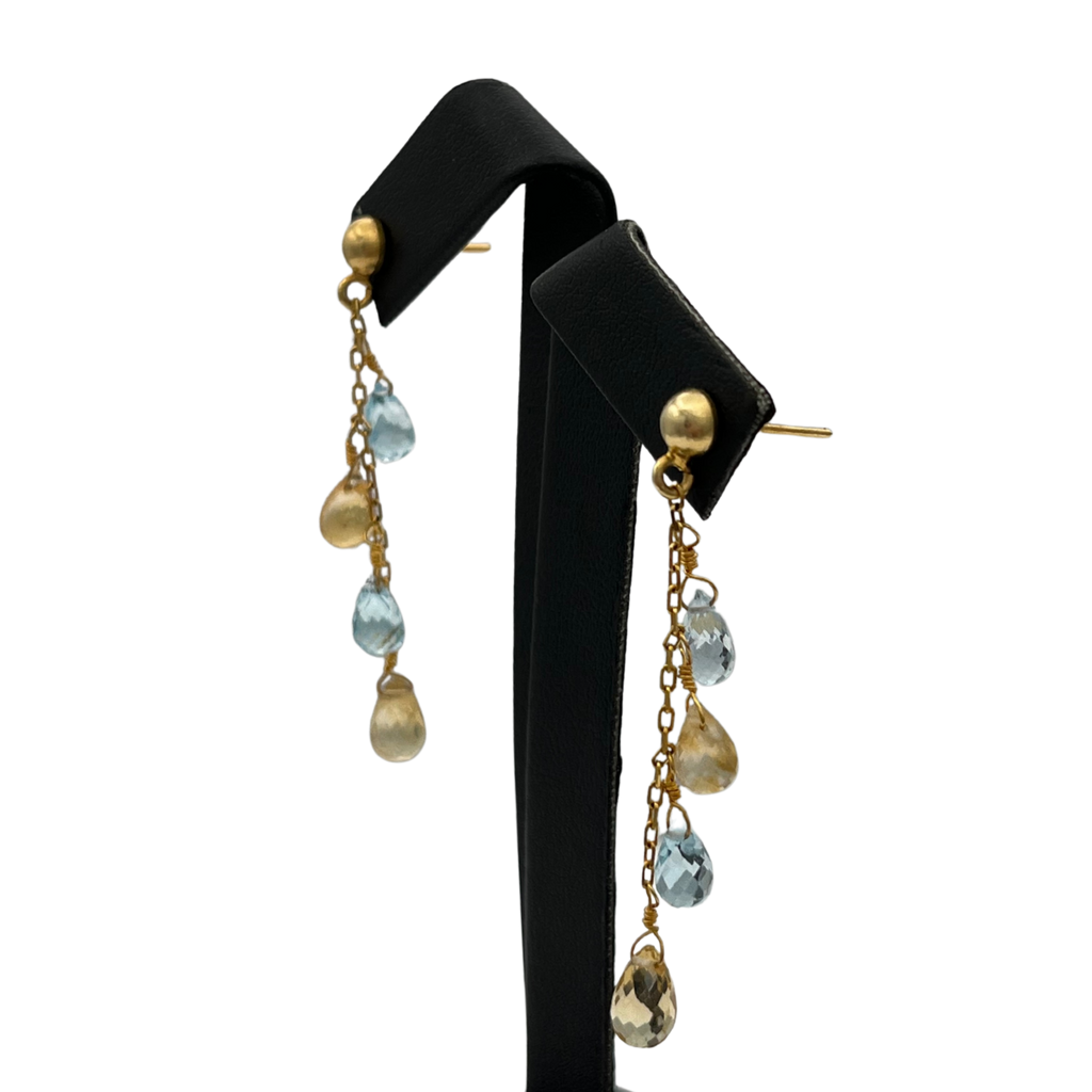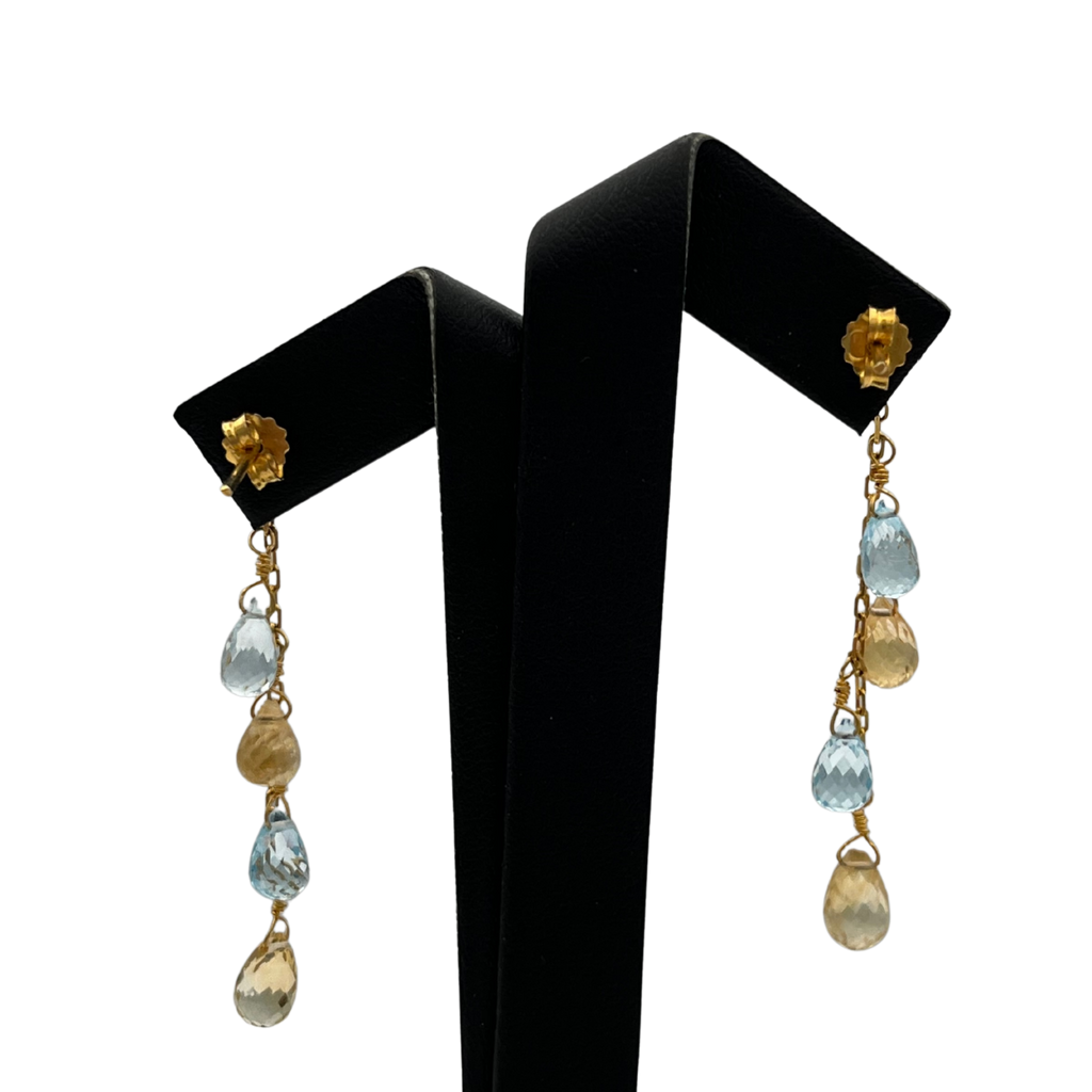Vintage 14k yellow gold drop earrings featuring cascading briolette cut blue and lemon quartz. Earrings are worn with a post and butterfly back.