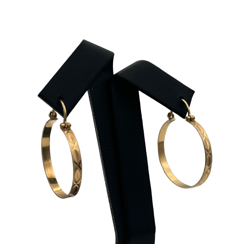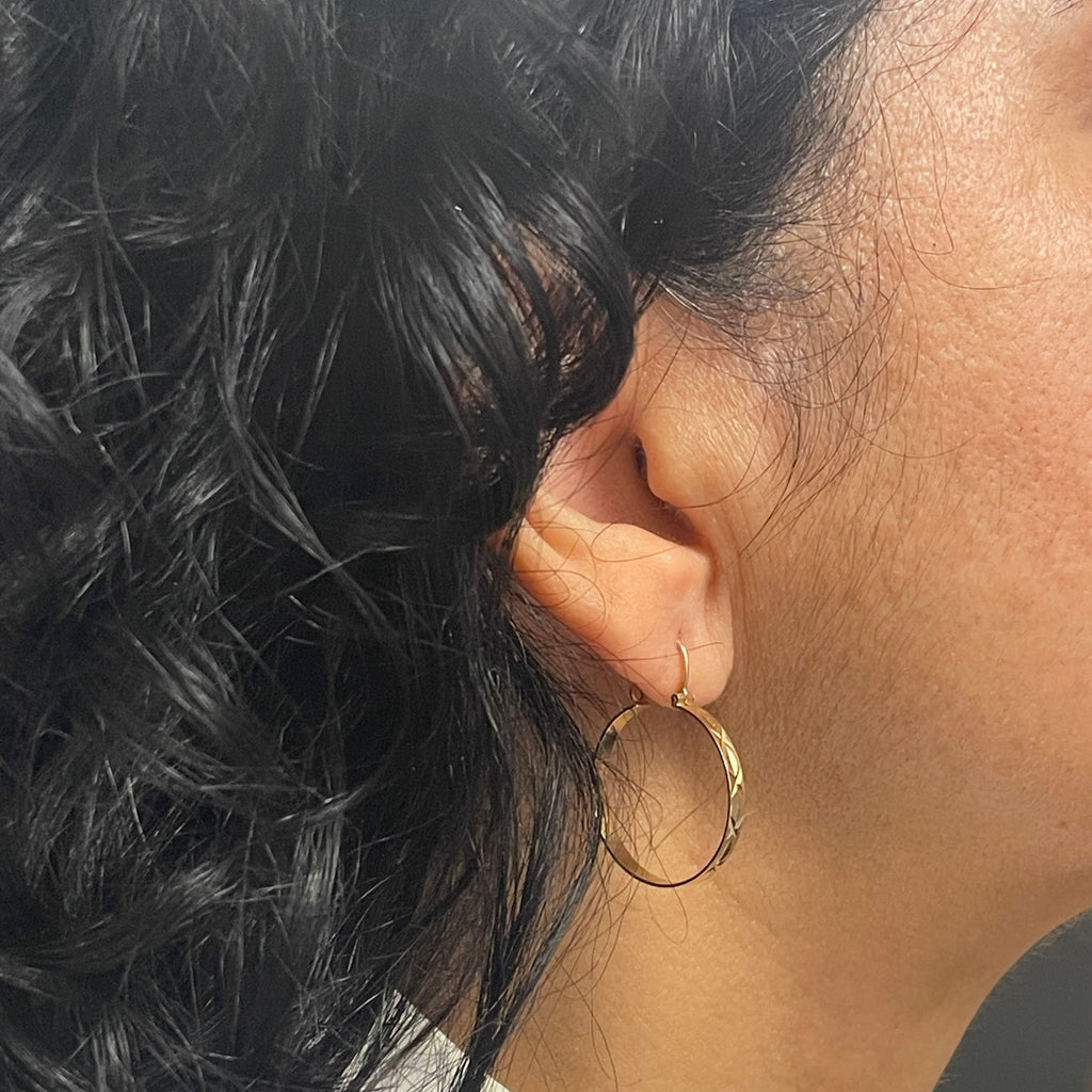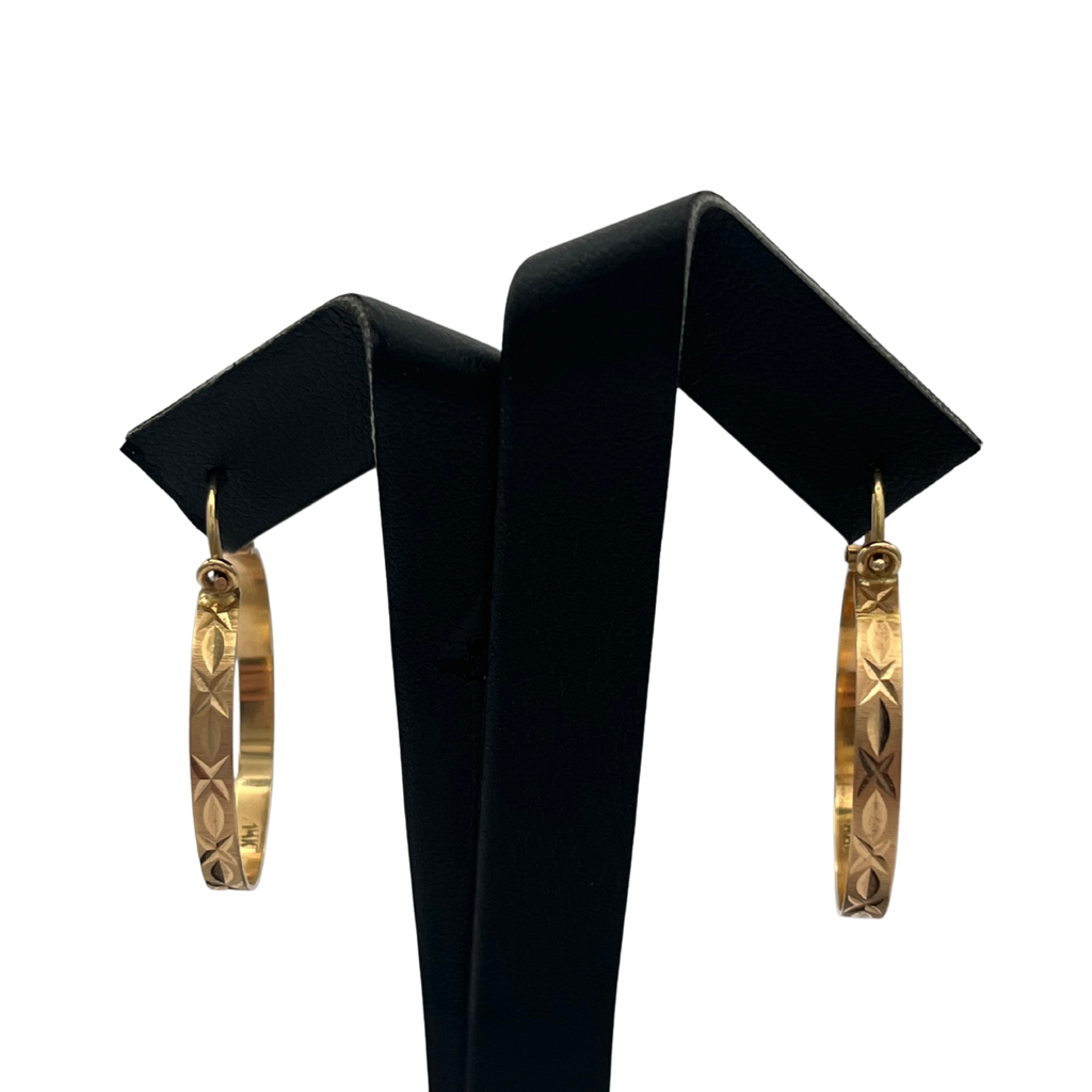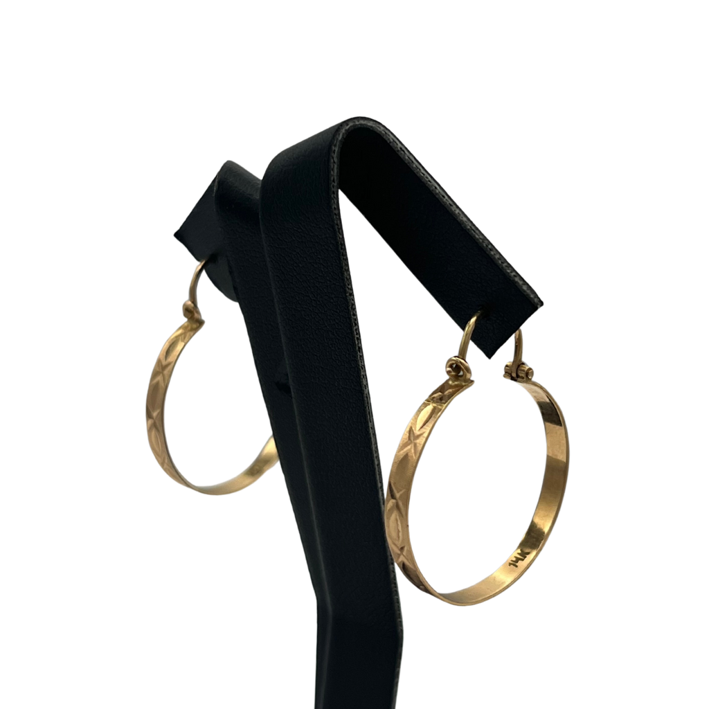 Classic vintage 14k yellow gold round hoop earrings. These timeless earrings showing stunning textured engraving with high luster polish.