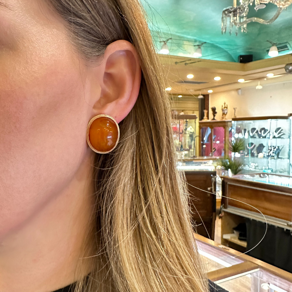 Lovely pair of large statement oval cabochon cut rich cognac colored amber stones framed in buttery 14k yellow gold frames.