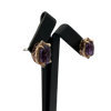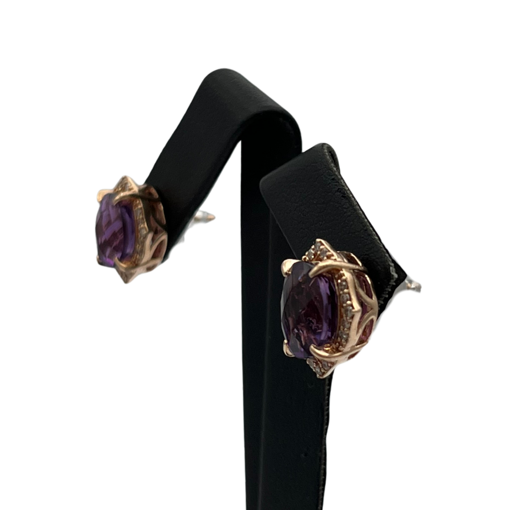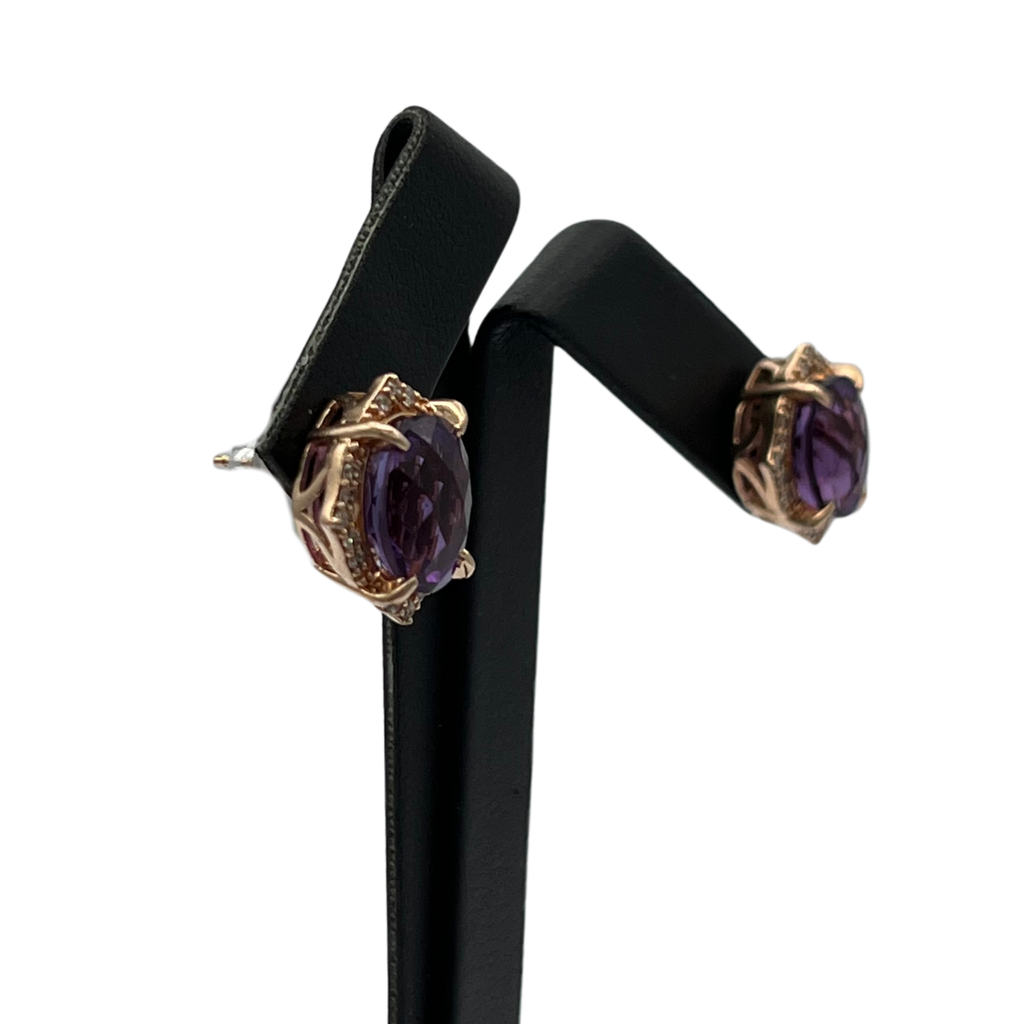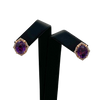 Vintage stud earrings with a checkerboard facet amethyst center stone surrounded by a frame of pavé diamonds in 14k rose gold.