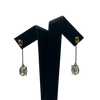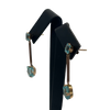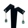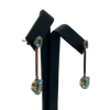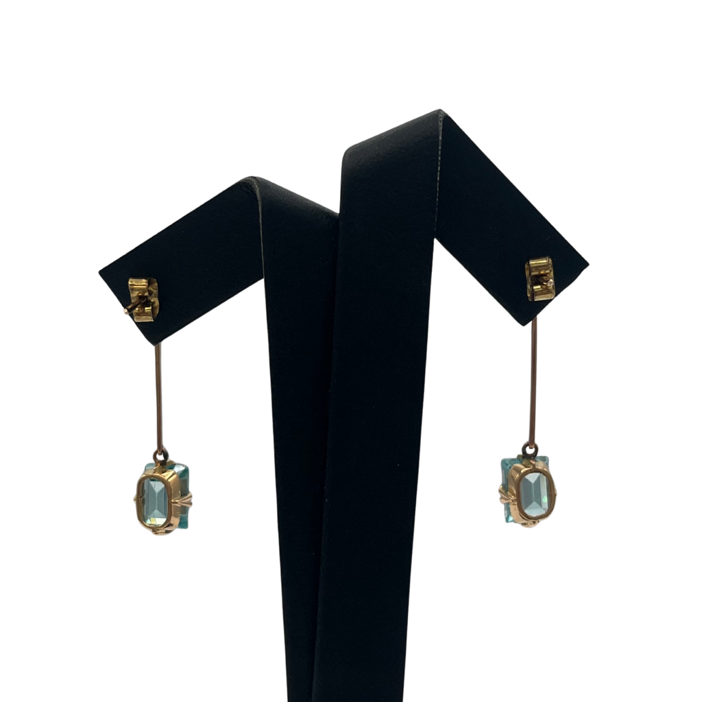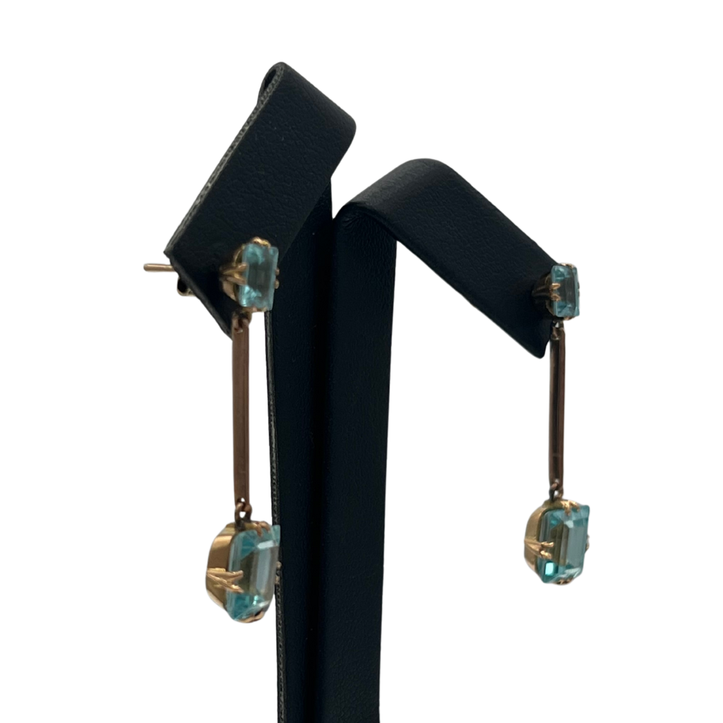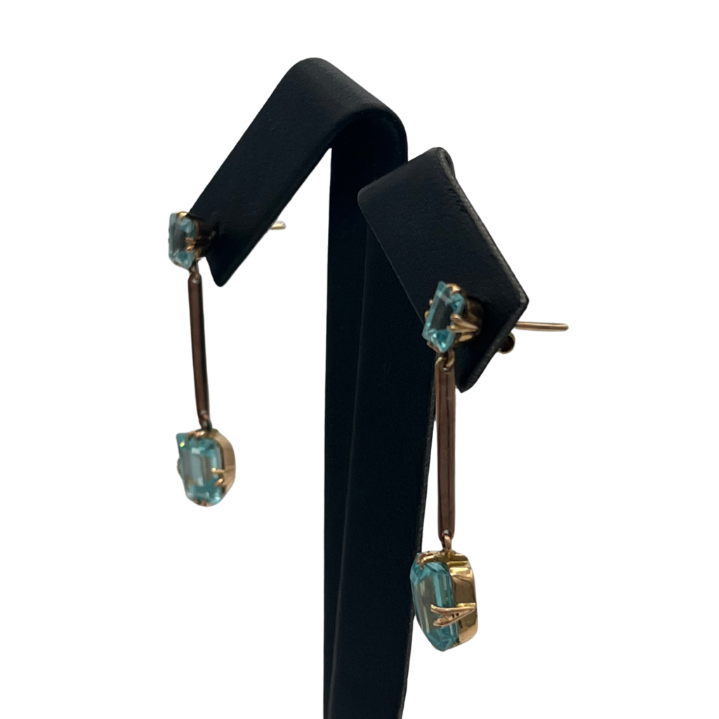 Vintage blue zircon and 14k rose gold drop earrings dating to the 1930's. The earrings feature a smaller stone at the post and a larger stone at the bottom which are connected by a thin rose gold bar. Earrings are worn with a post and butterfly back.