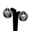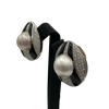 Bold and beautiful hand made vintage earrings featuring fabulous iridescent Mabe pearls bezel set in a rounded teardrop frame of pavé diamond and black onyx cabochon cut alternating stripes. The earrings fasten with a post and oversized hand made omega clip.