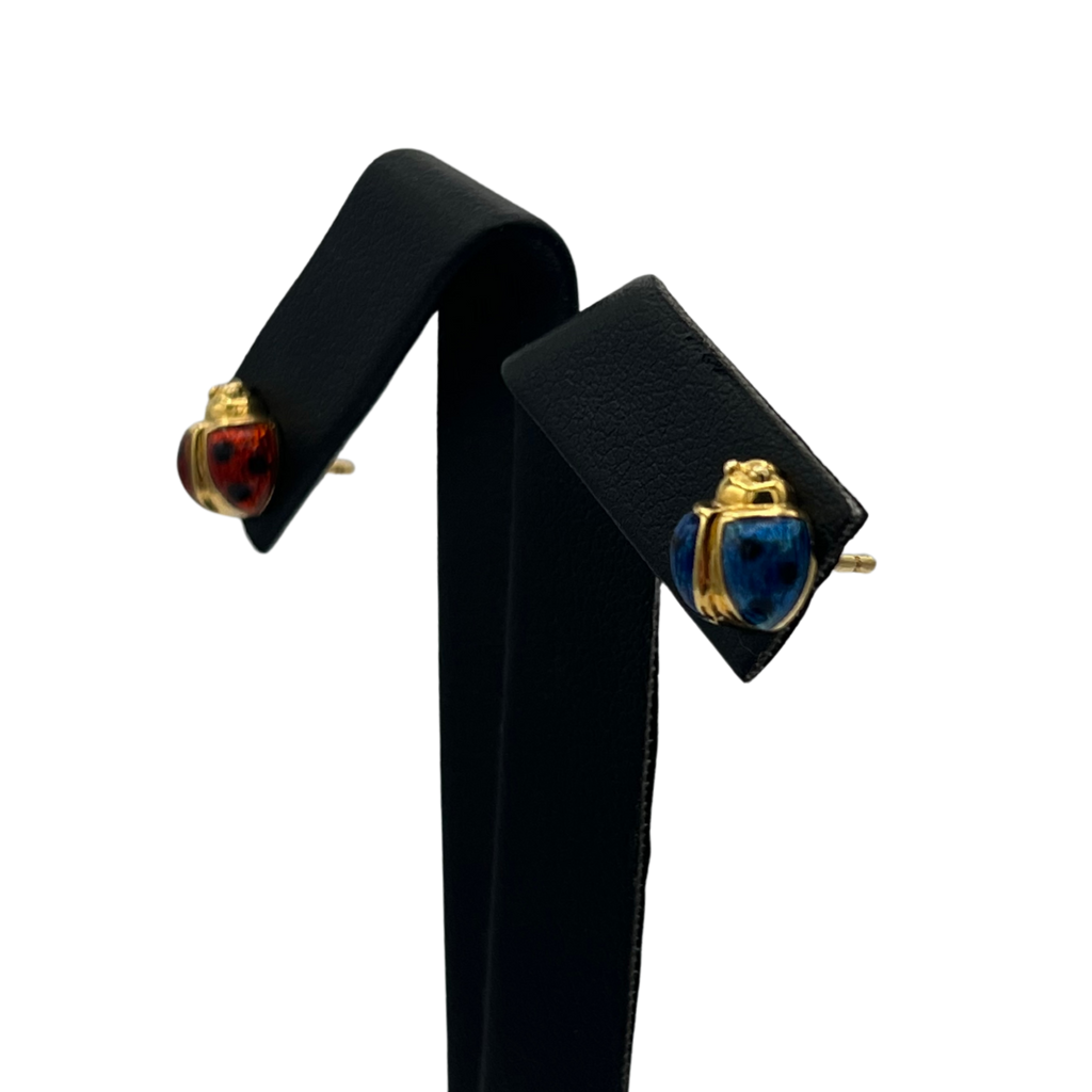 Vintage red and blue enamel ladybug stud earrings in 18k yellow gold.