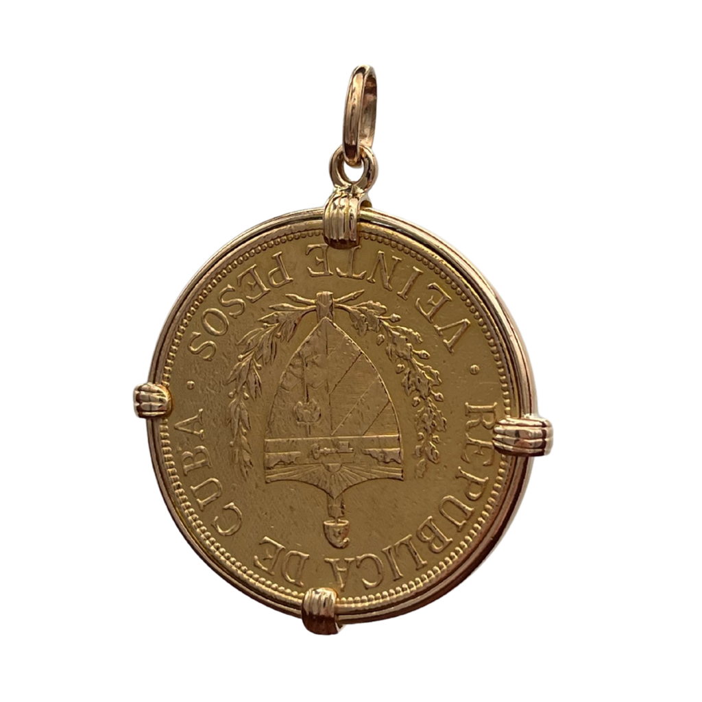 21.6k gold 1915 20 Pesos coin on 18k yellow gold frame.