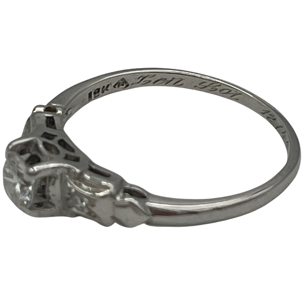 A truly delightful, dainty three-stone diamond ring in 18k white gold. This ring features openwork and an Ionic scroll motif around the secondary stones. The inner band of the ring is hand engraved in script " ... 12/44"