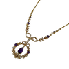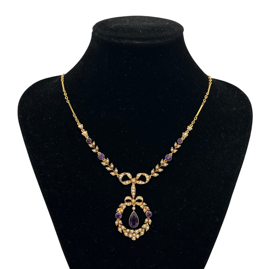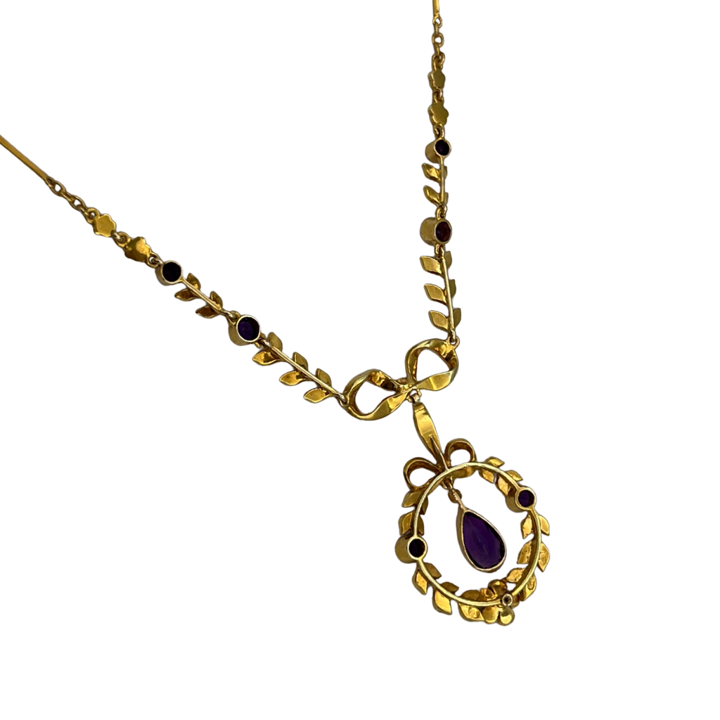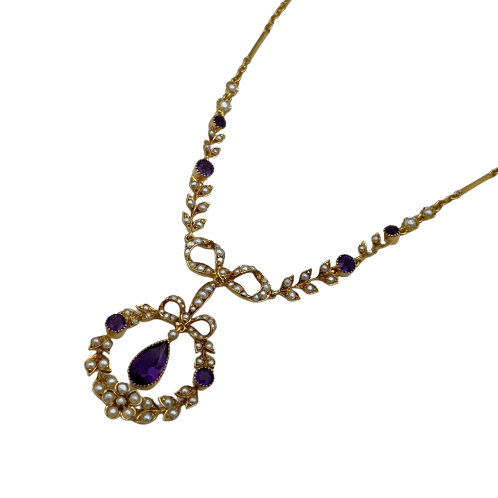 Stunning antique lavalier necklace in 15k yellow gold featuring deep, vibrant purple amethysts, decorated with seed pearl wreath, set in a lovely leaf and bow design. The articulated pendant hangs flatteringly from a delicate bar and link-style chain.