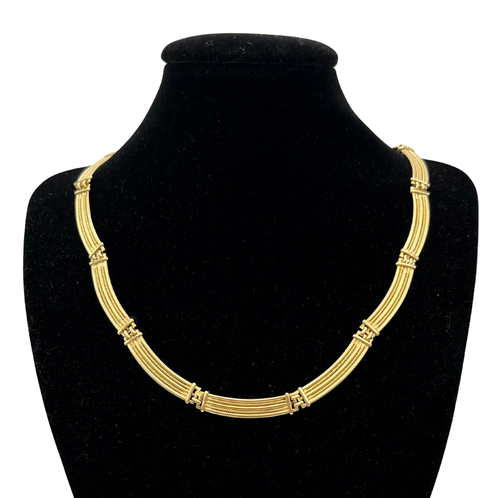 Vintage decorated curved bar link necklace in 18k yellow gold with a push clasp and figure eight safety lock.