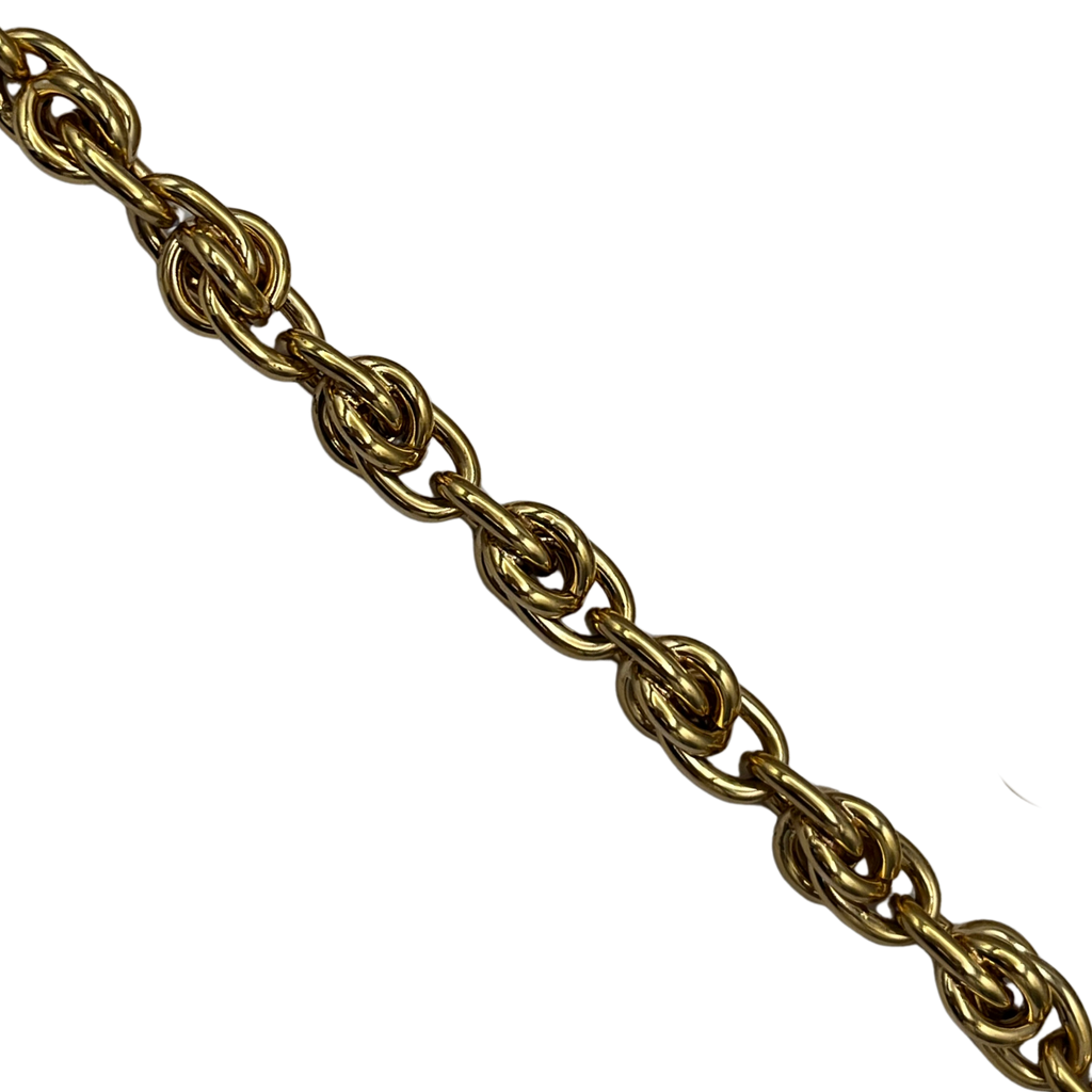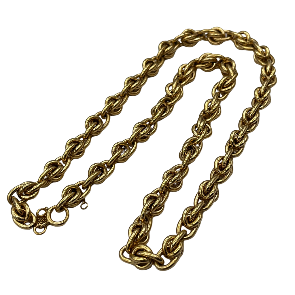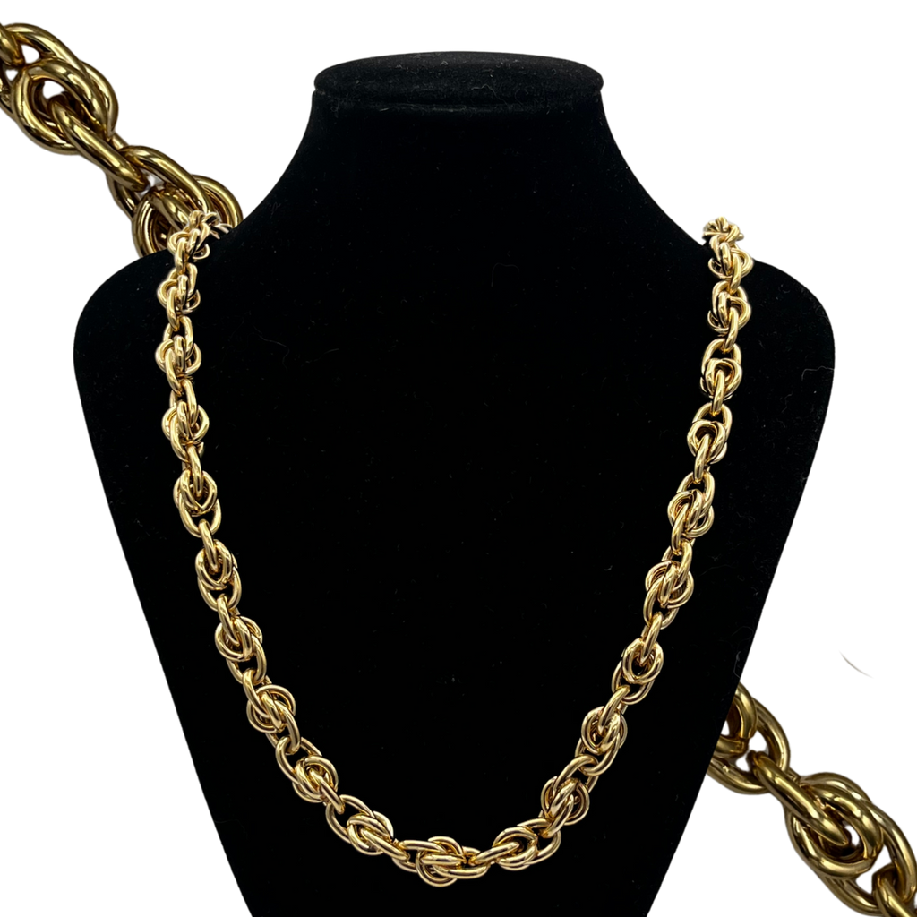 Beautiful vintage heavy hollow 14k yellow gold interlocking fancy link chain necklace with a high polish finish. Gold thickness is approximately 1.5mm thick which guarantees this piece will stand the test of time. Necklace has a safety chain which attaches in the middle with a closure.
