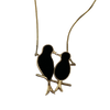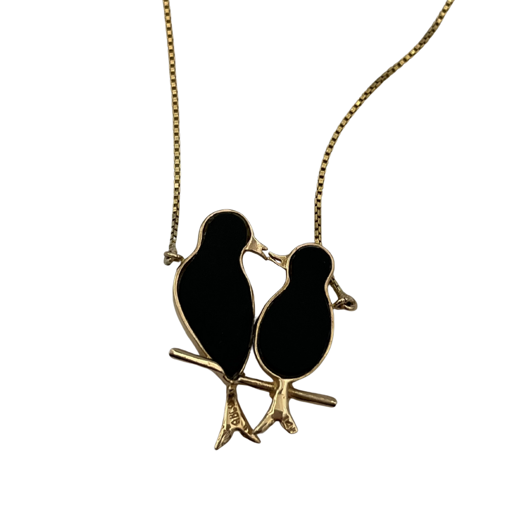 Adorable 14k yellow gold necklace depicting two perched hardstone onyx blackbirds with diamond eyes fixed on a 0.3mm yellow gold box chain.