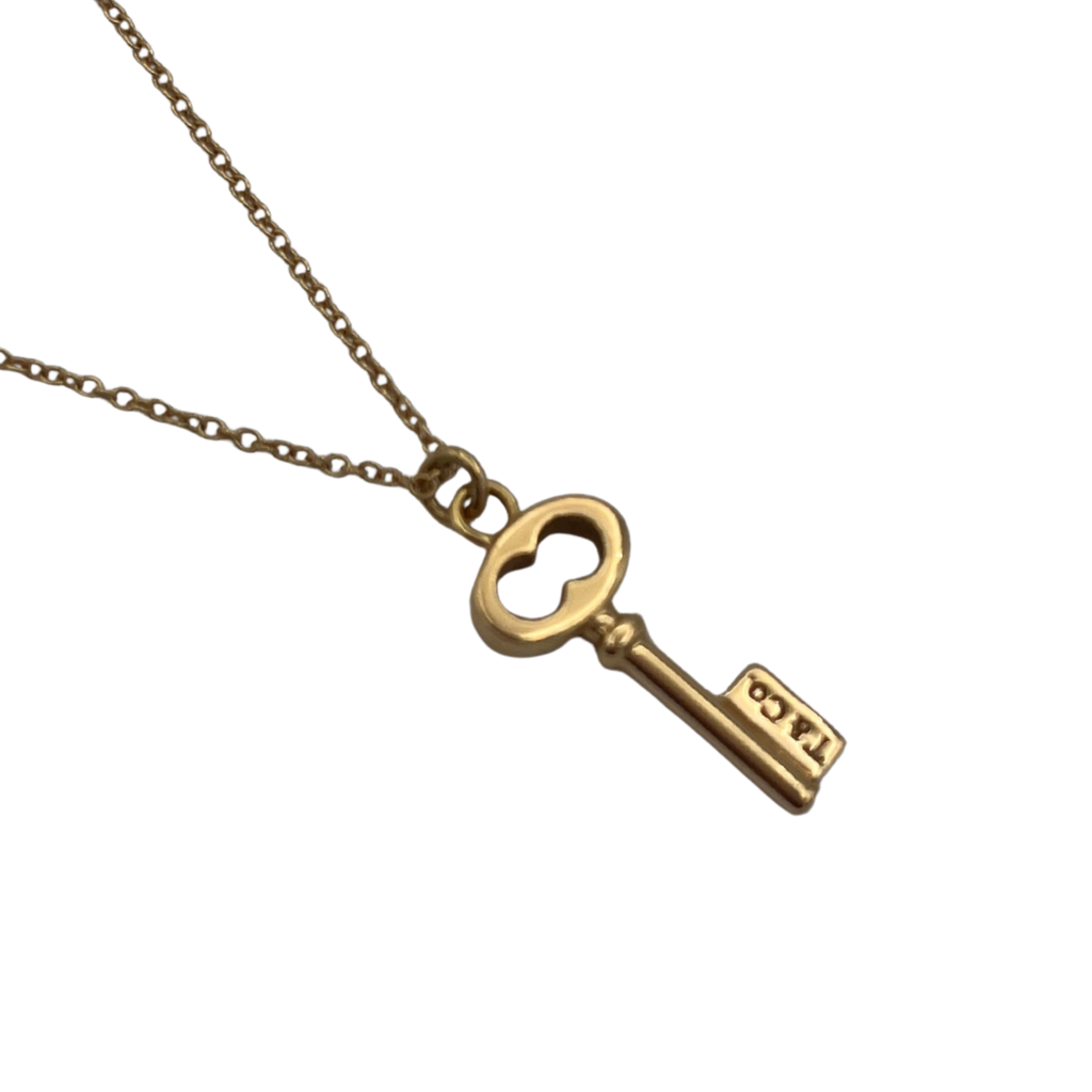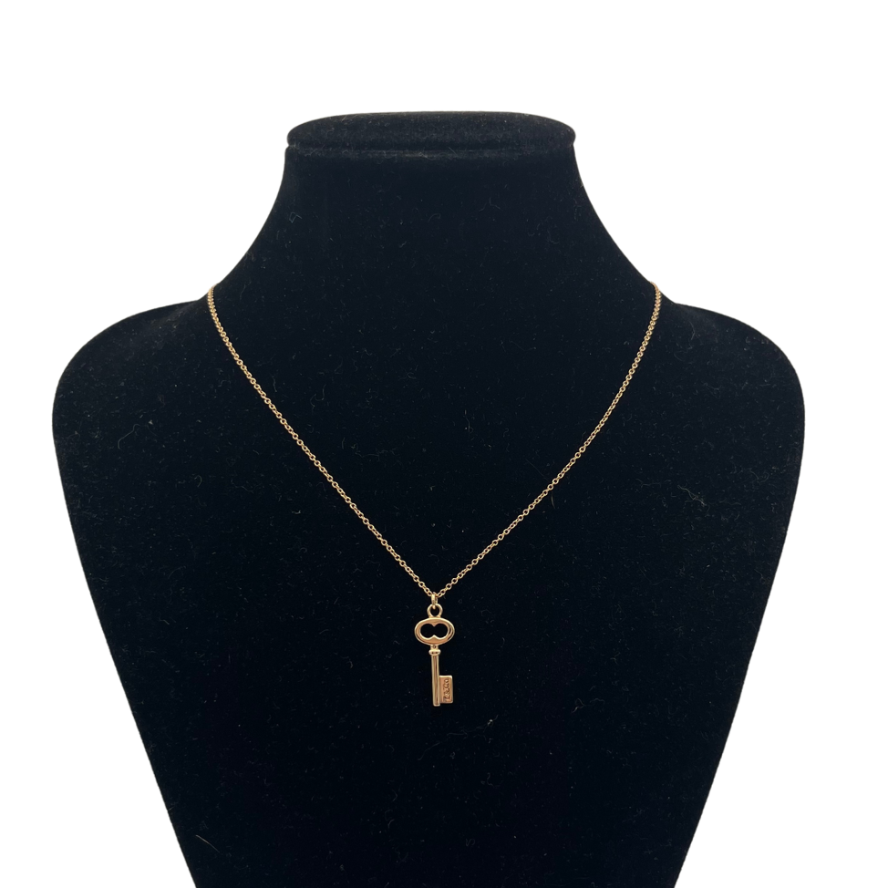 Vintage Tiffany & Co. mini key pendant necklace in rose gold.
