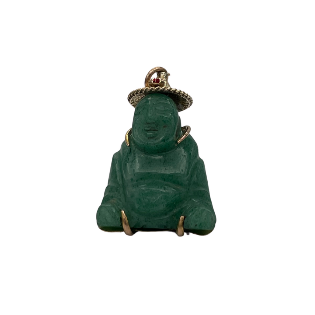 Genuine Vintage Carved Aventurine Quartz Buddha charm/pendant encased in 14k yellow/rose gold, with little decorative red glass stone on hat.