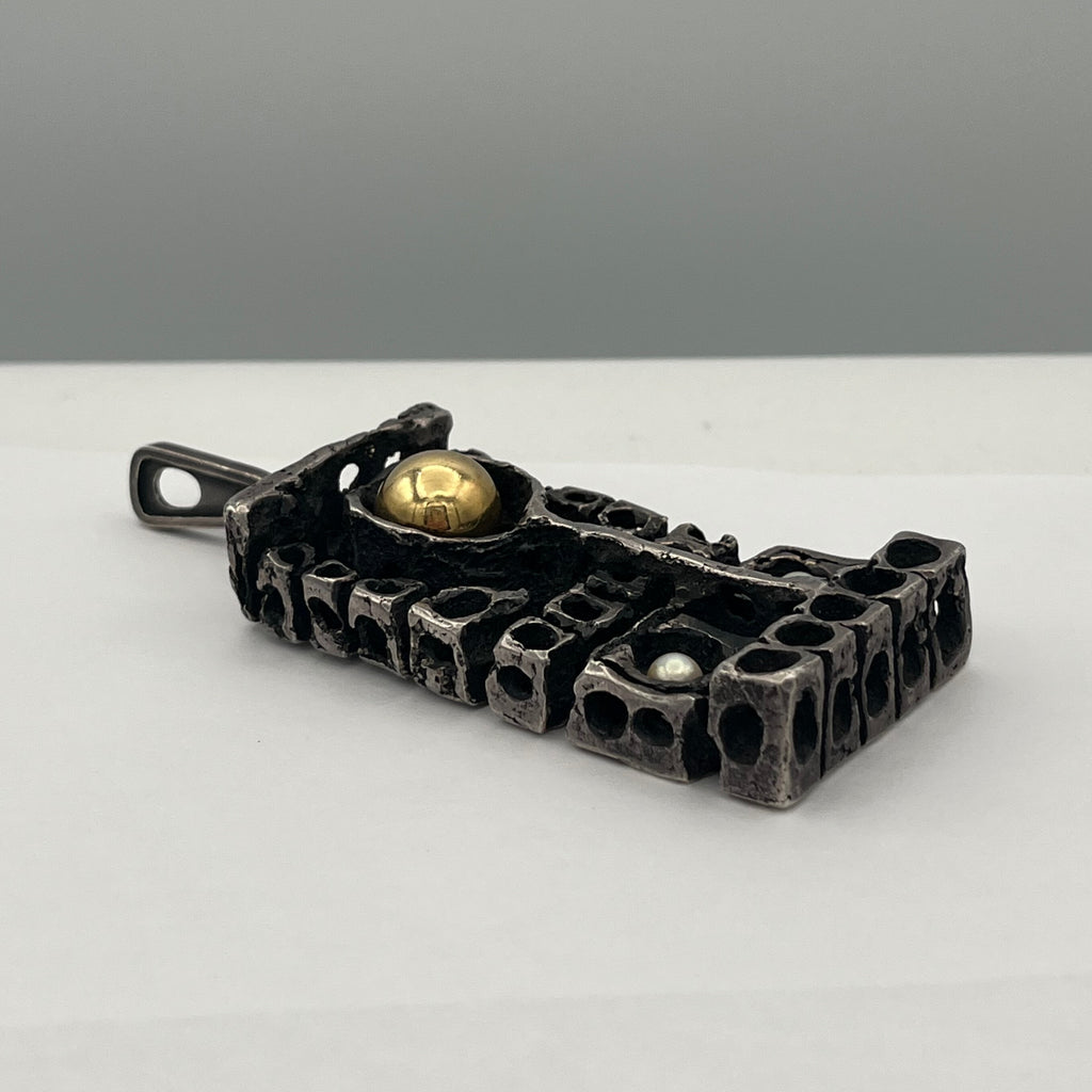 This signed Walter Schluep sterling silver pendant adorned with yellow gold and pearls is a wonderful example of Walter Schluep's ability to create wearable pieces of art.