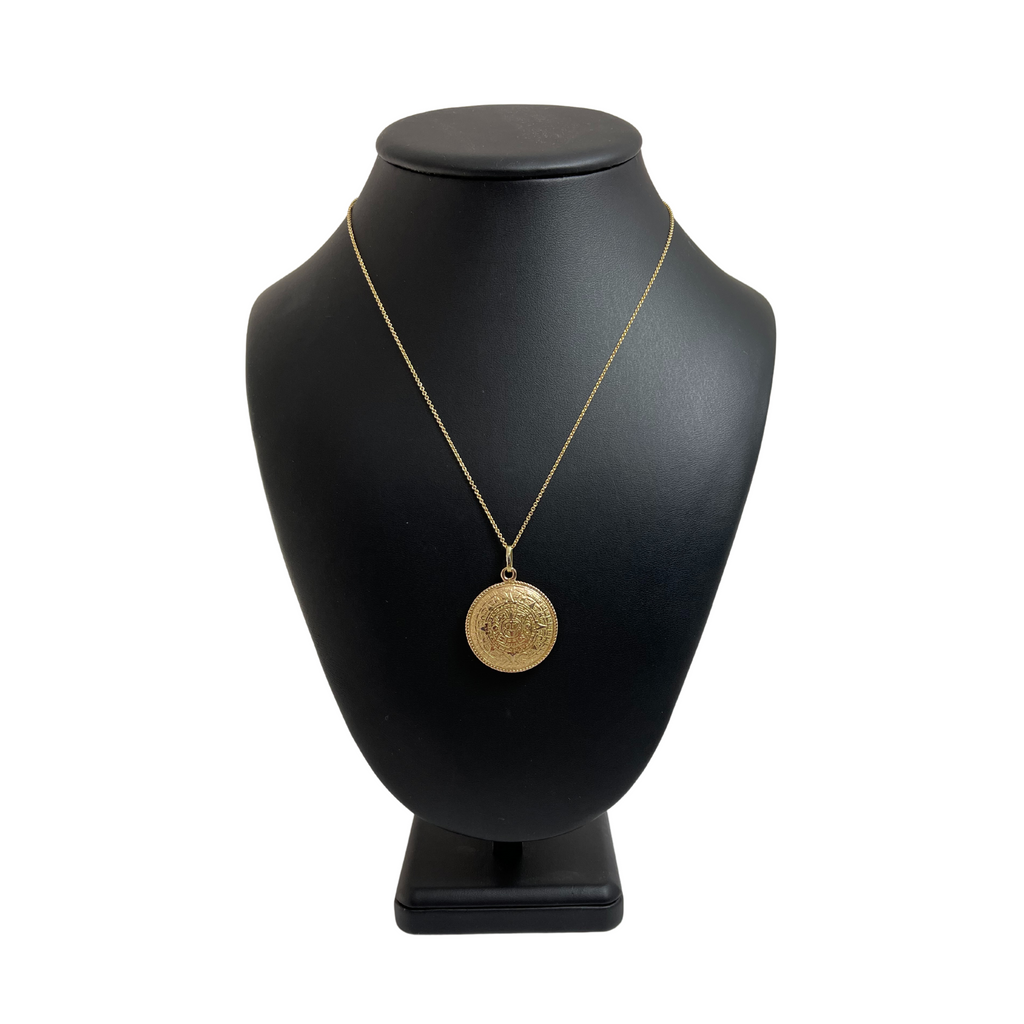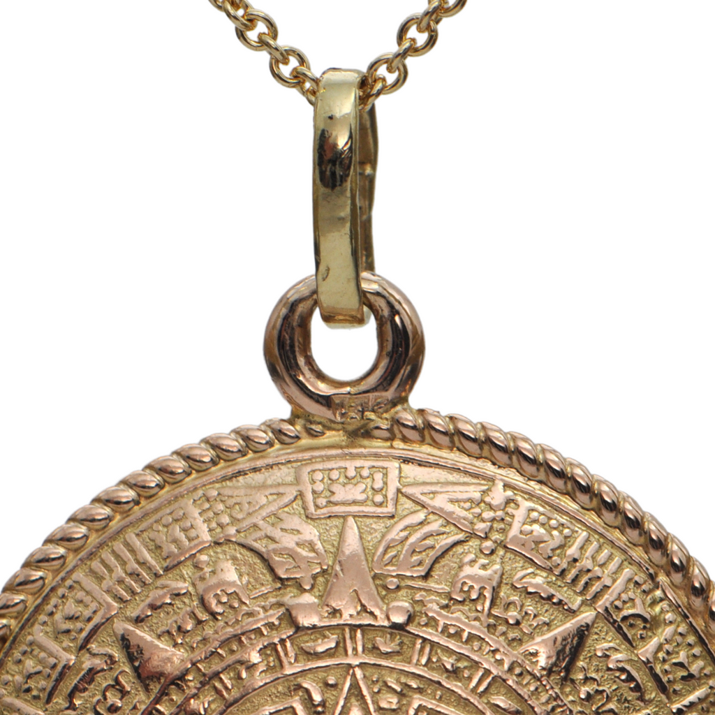 Superbly intricate (and heavy!) 18k yellow gold Aztec calendar pendant. The Aztec calendar which consists of a ritual cycle of 260 days and a 365-day civil cycle was extremely important as it not only tracked the day count but was used for tracking religious ceremonies. It divided time equally among the various gods and kept the universe in balance.