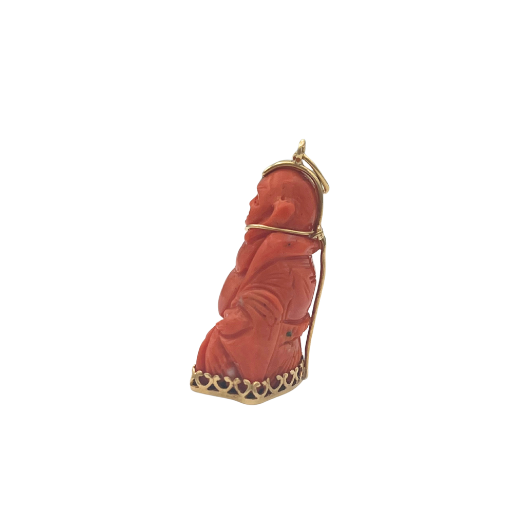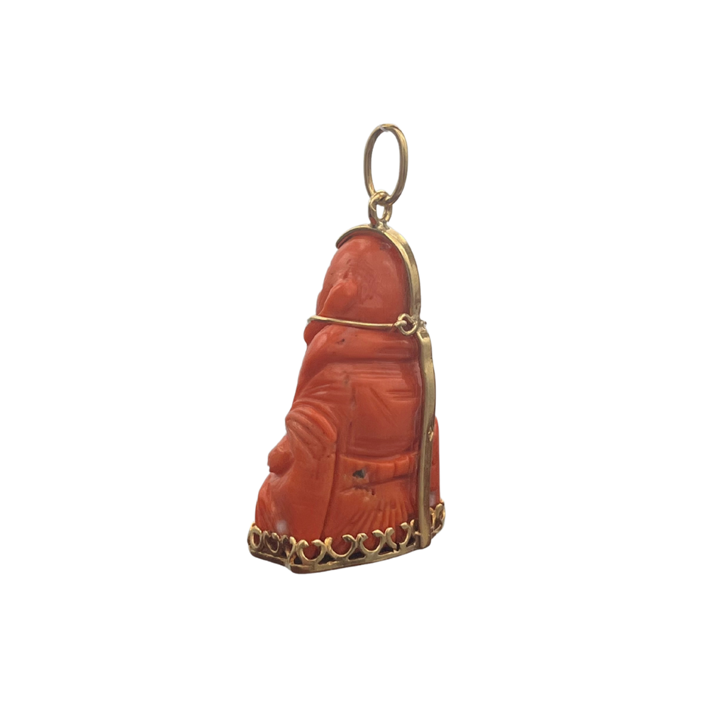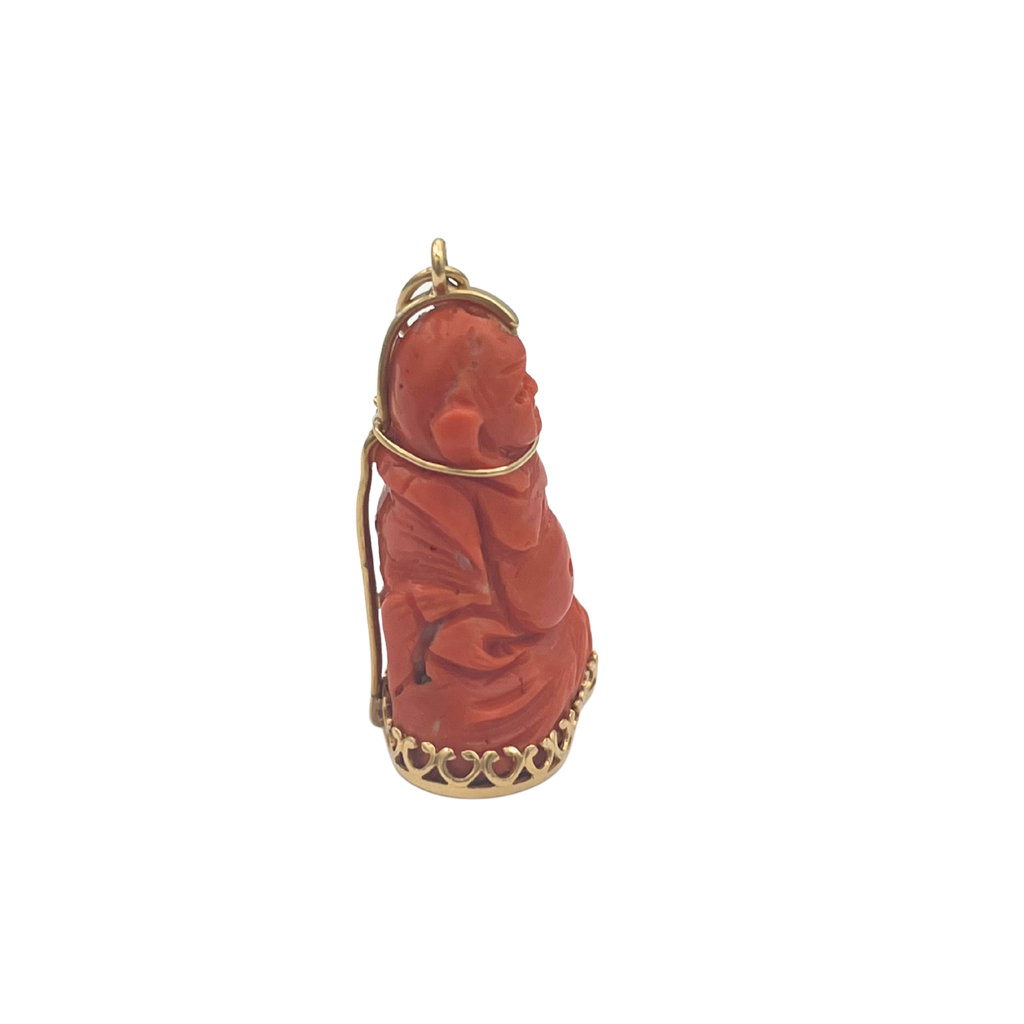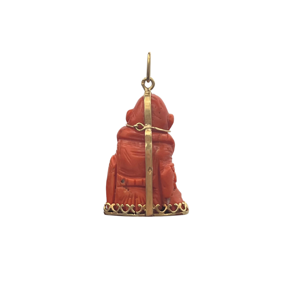 Vintage Hand-Carved Coral Buddha Figural Pendant on 18k Yellow Gold Base