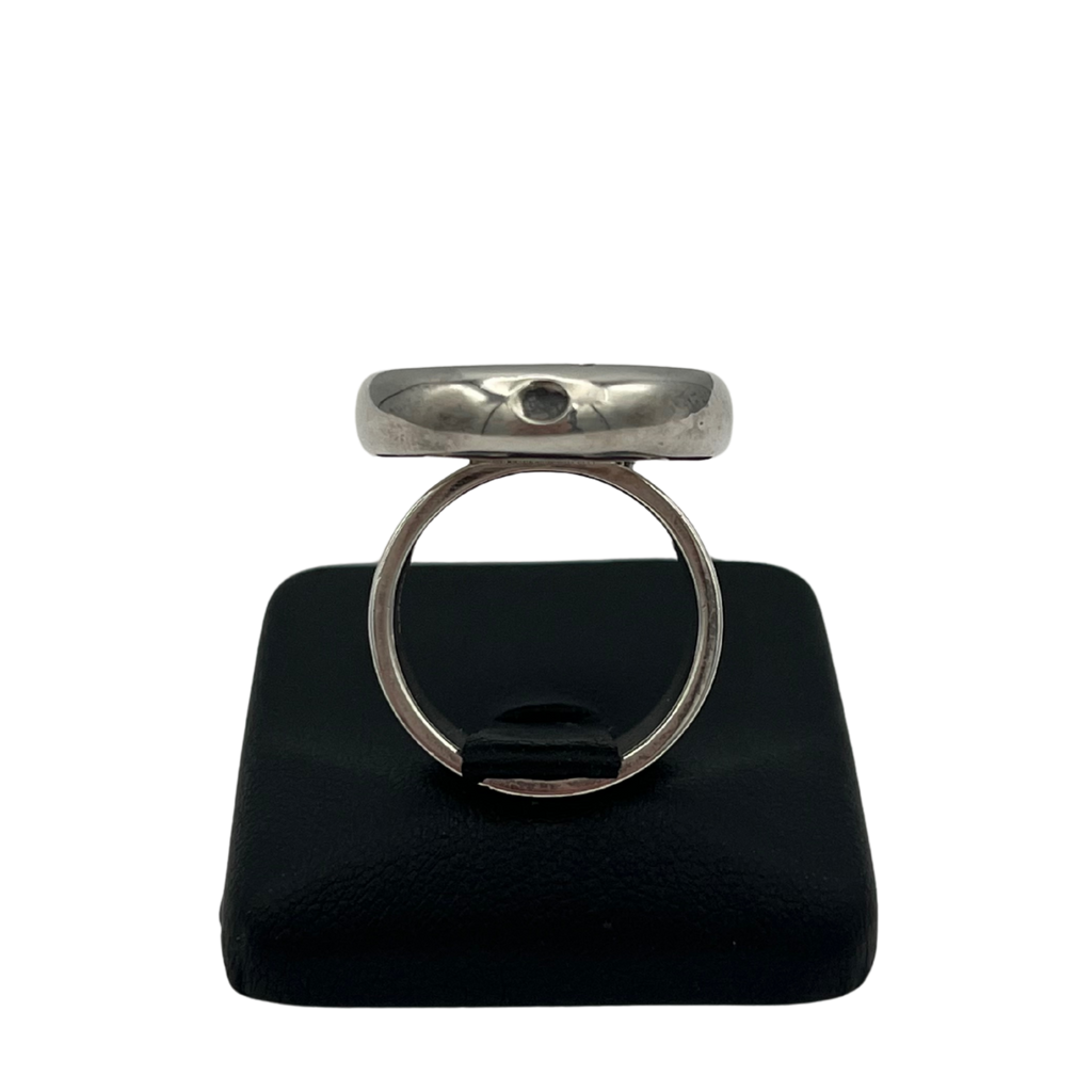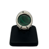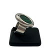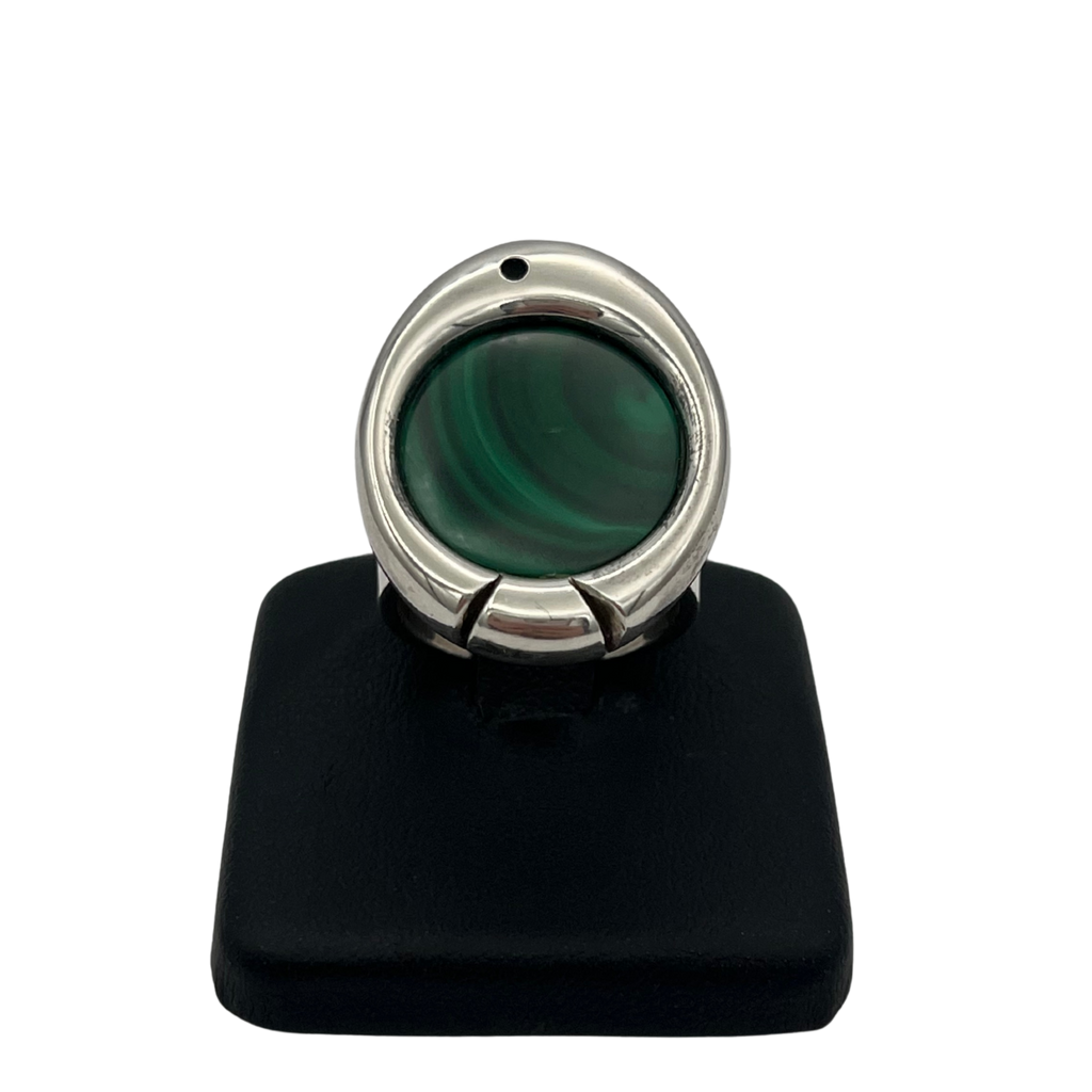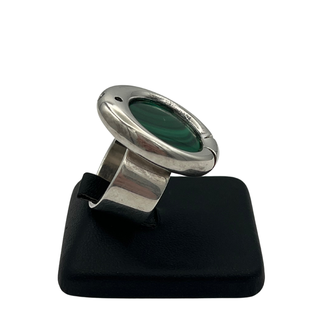 Estate signed Walter Schluep Sterling dating to 1979, silver oval fish ring with a beautiful round polished malachite set in the center.