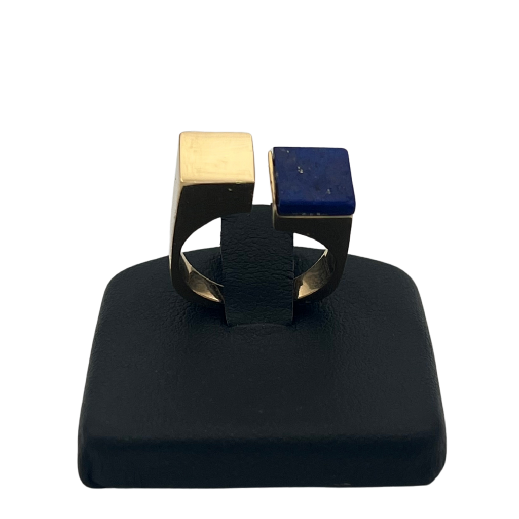 Vintage 18k yellow gold open-design ring with geometric square high polish gold and lapis lazuli.