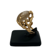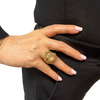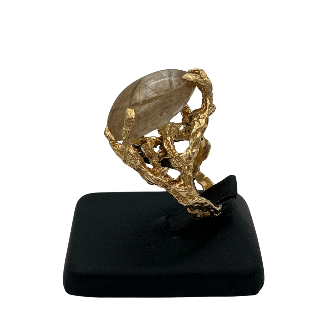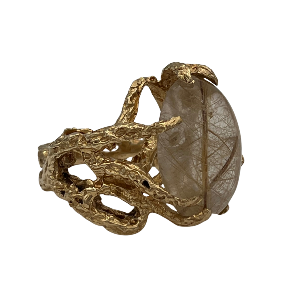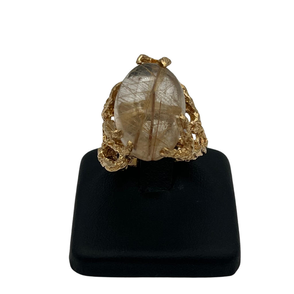 Vintage rutilated quartz cabochon set in an abstract, textured 14k yellow gold ring. This variety of quartz, also known as 'Venus' Hair Stone', is valued for it's golden needle-like inclusions visible in the stone.