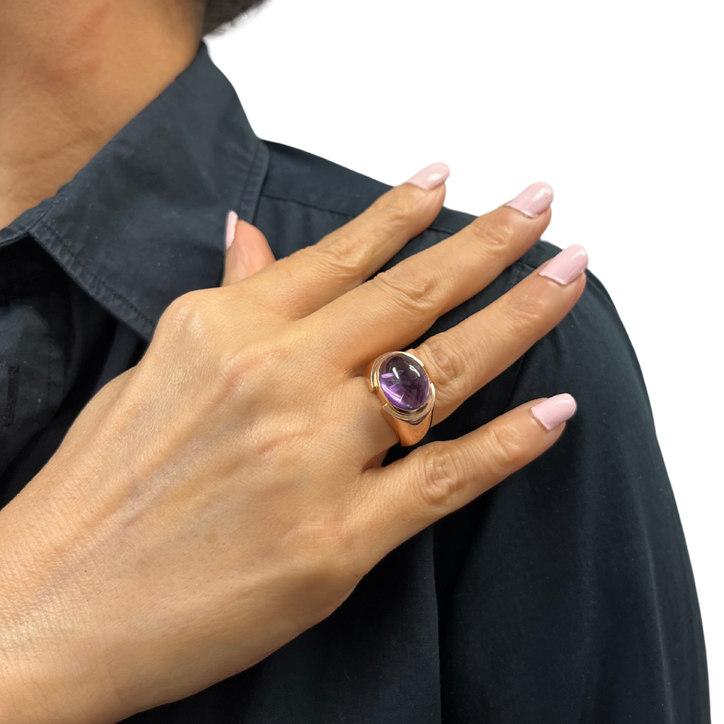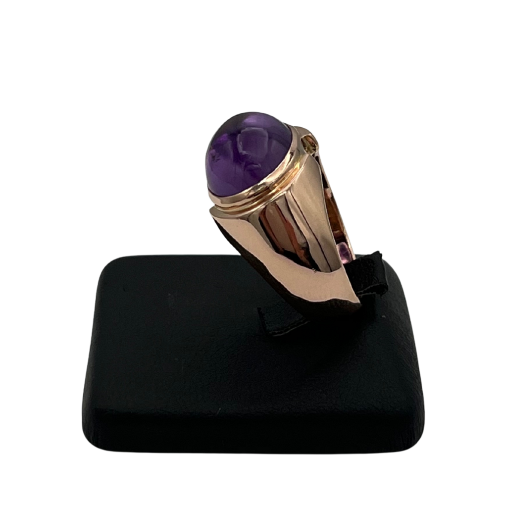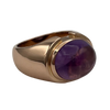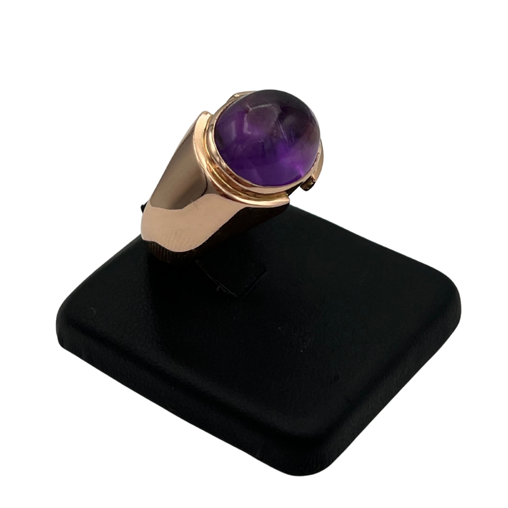 Vintage high polish 14k rose gold ring with a large oval cabochon cut amethyst.