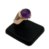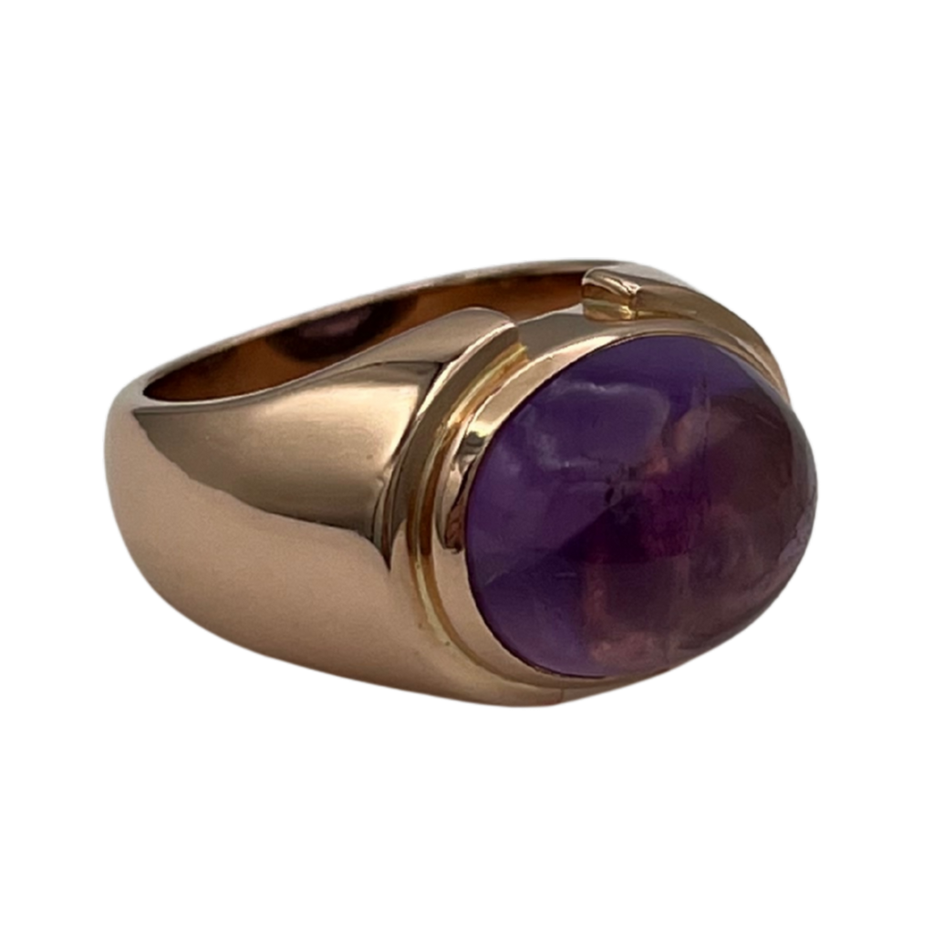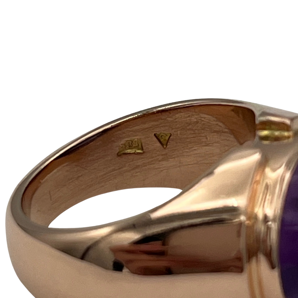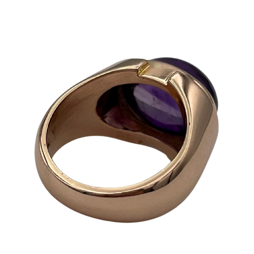 Vintage high polish 14k rose gold ring with a large oval cabochon cut amethyst.