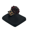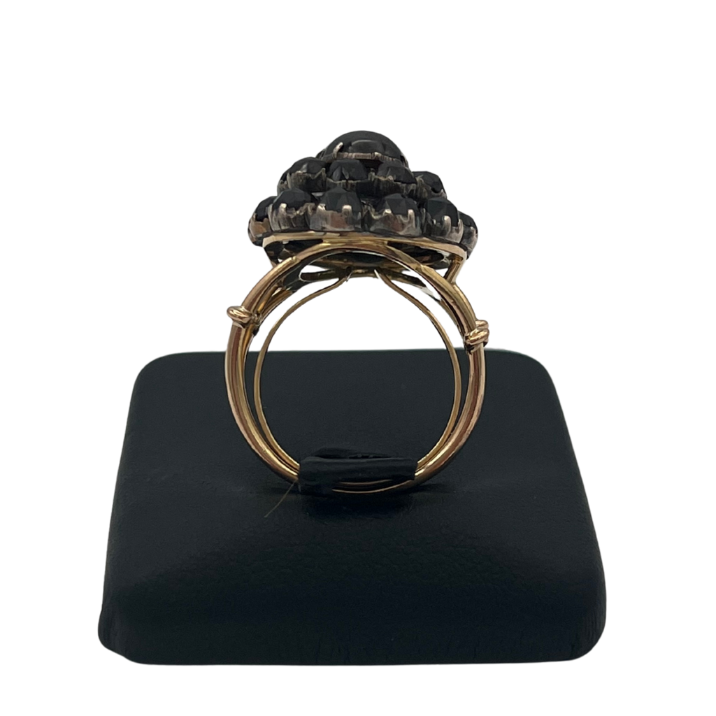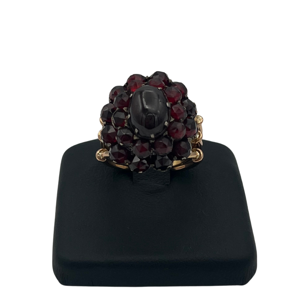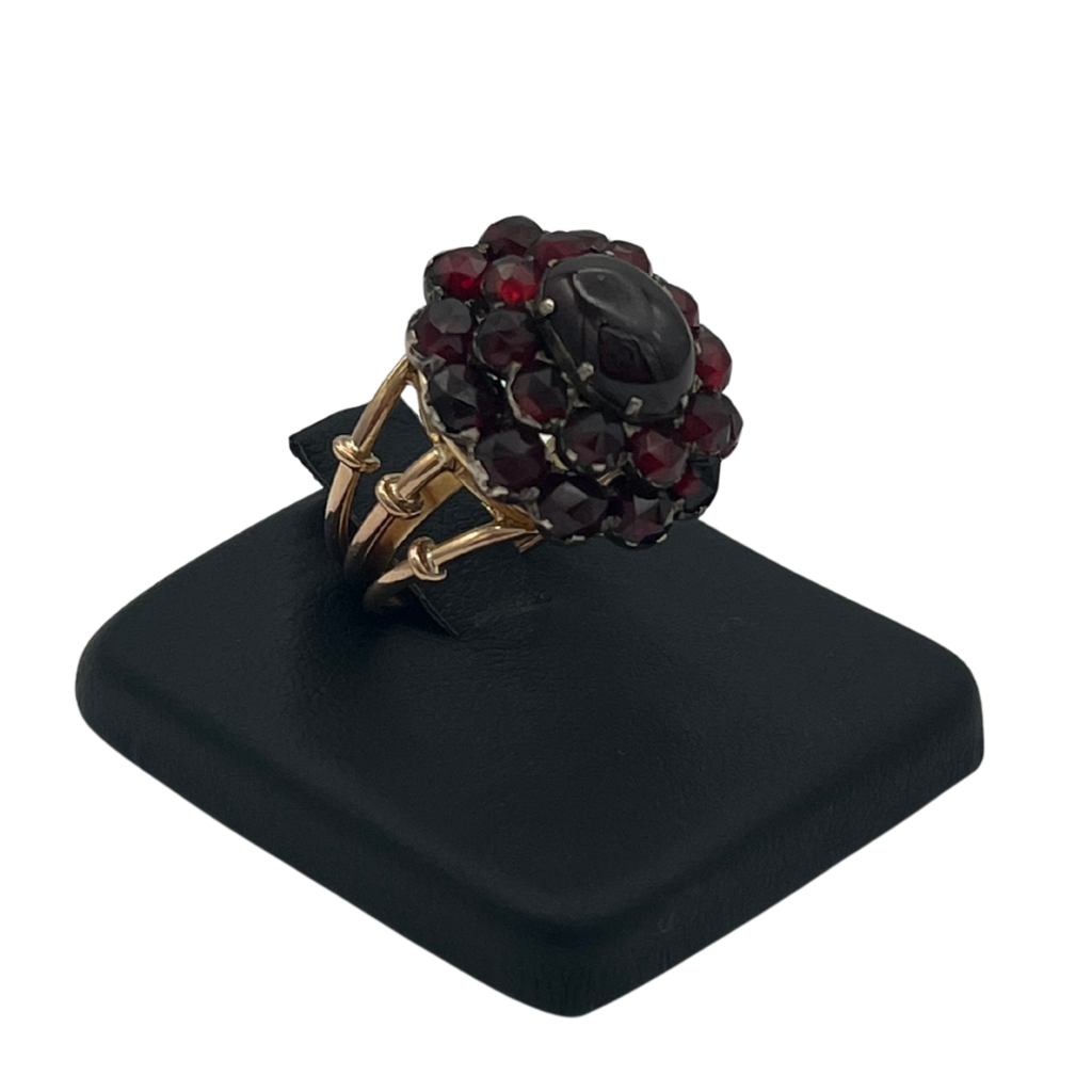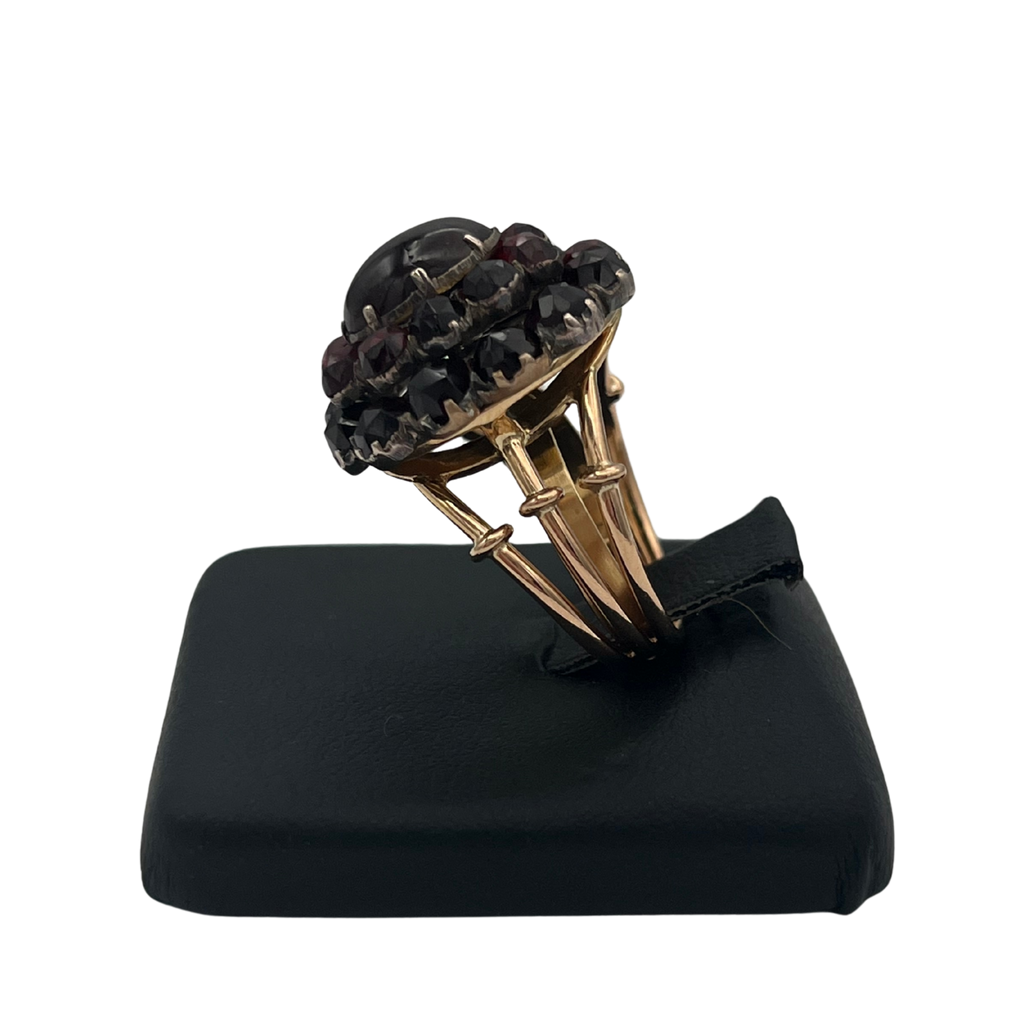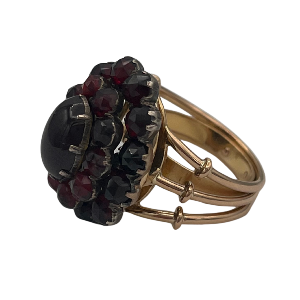 This ring features an antique garnet cluster gallery set in silver, on a vintage 18k rose gold tri-split shank with U-guard on band interior for sizing.