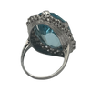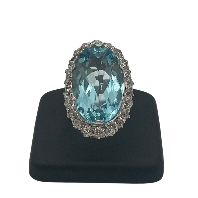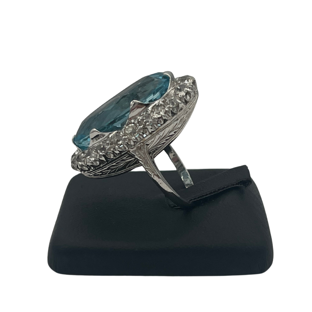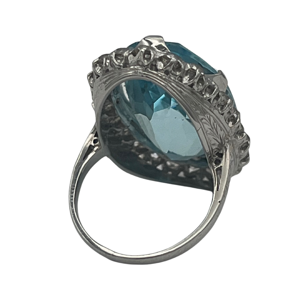 Elegant antique Edwardian (C. 1900's) 18.34ct aquamarine with diamond halo 18k white gold ring. Shank is beautifully engraved with a foliate style motif.