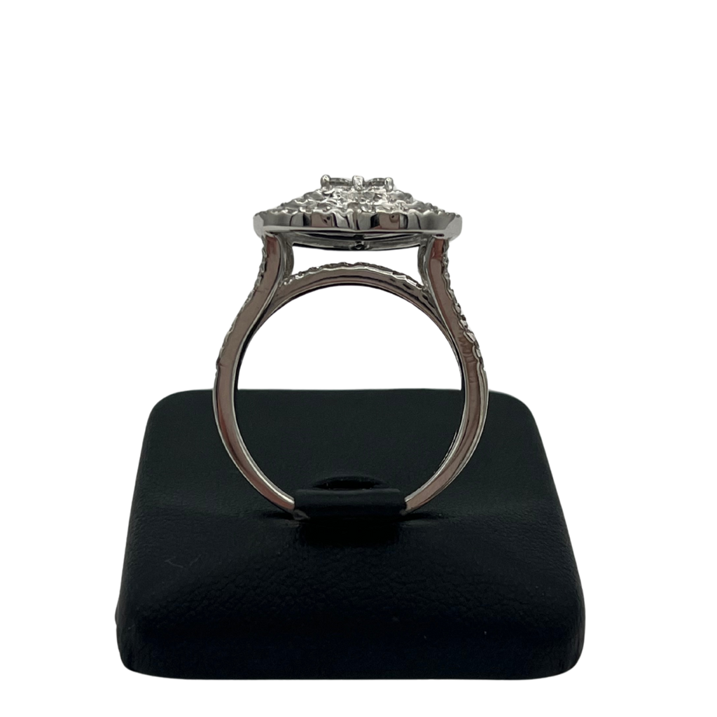 Three larger prong set diamonds make up the center heart. One (1) princess cut diamond measuring approximately 2.4mm x 2.4mm. Two (2) round brilliant cut diamonds measuring approximately 2.5mm each in diameter with an estimated VS clarity and F/G colour.