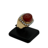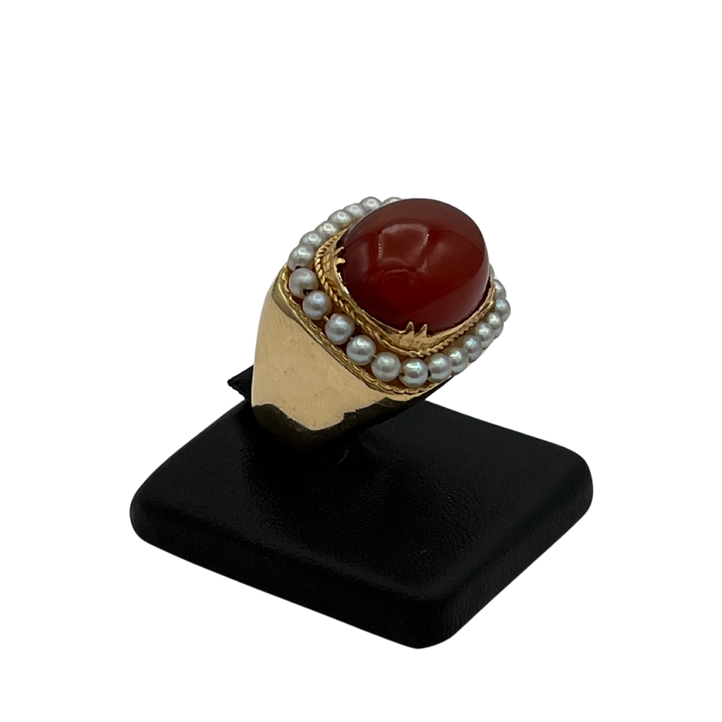 Beautiful vintage ring from the 1940's featuring an oval cabochon cut carnelian stone set with an East/West orientation, surrounded by a ring of wire-strung pearls. The band of the ring is made of solid 14k yellow gold with a high polish finish.