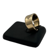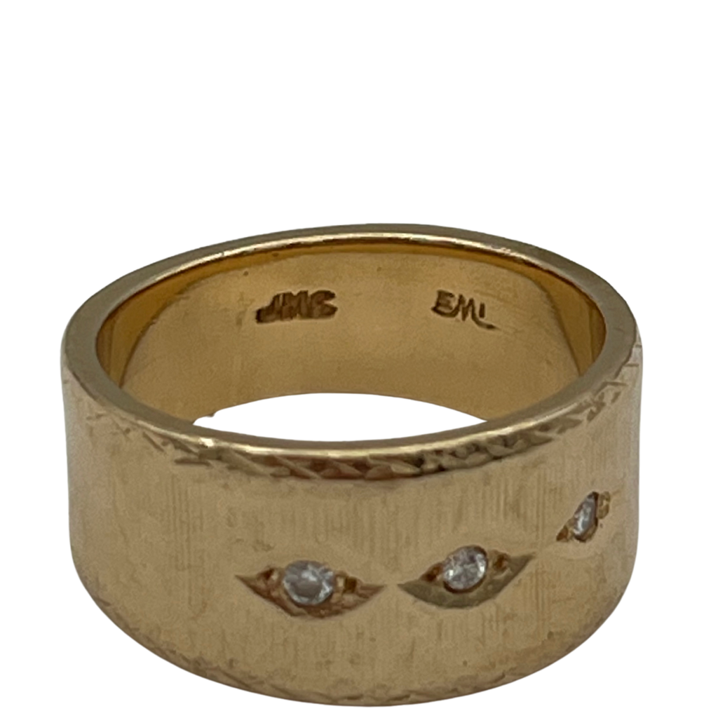 Designed to resemble the band on a cigar, the cigar band ring style has seen a jump in popularity recently. This lovely vintage solid 14k yellow gold ring features a satin (or brush) finish with an etched border and is adorned with three pre-set diamonds.