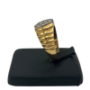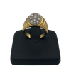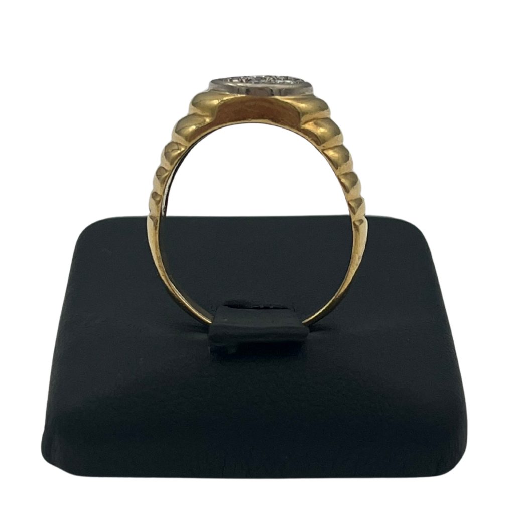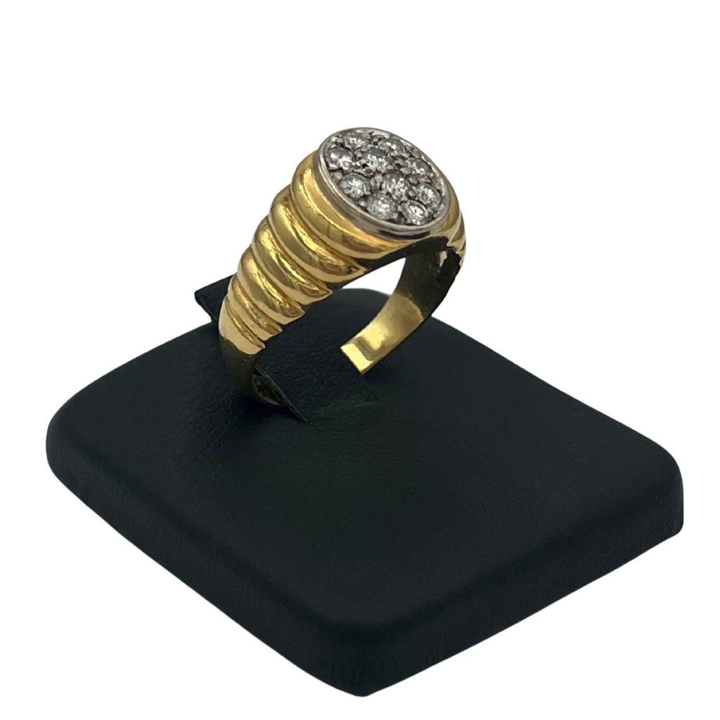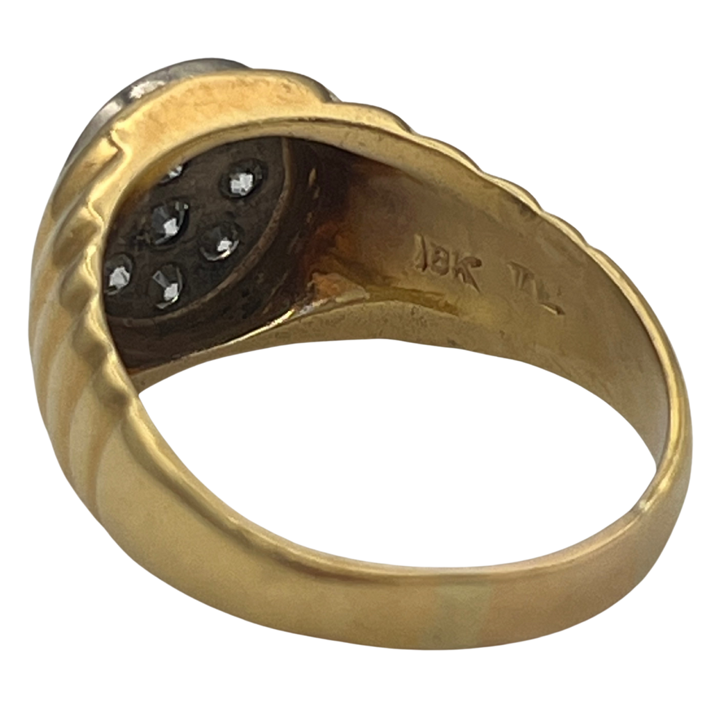 Vintage 18k yellow gold ring with an oval cluster of diamonds set in white gold, with a ridged texture along the band.