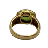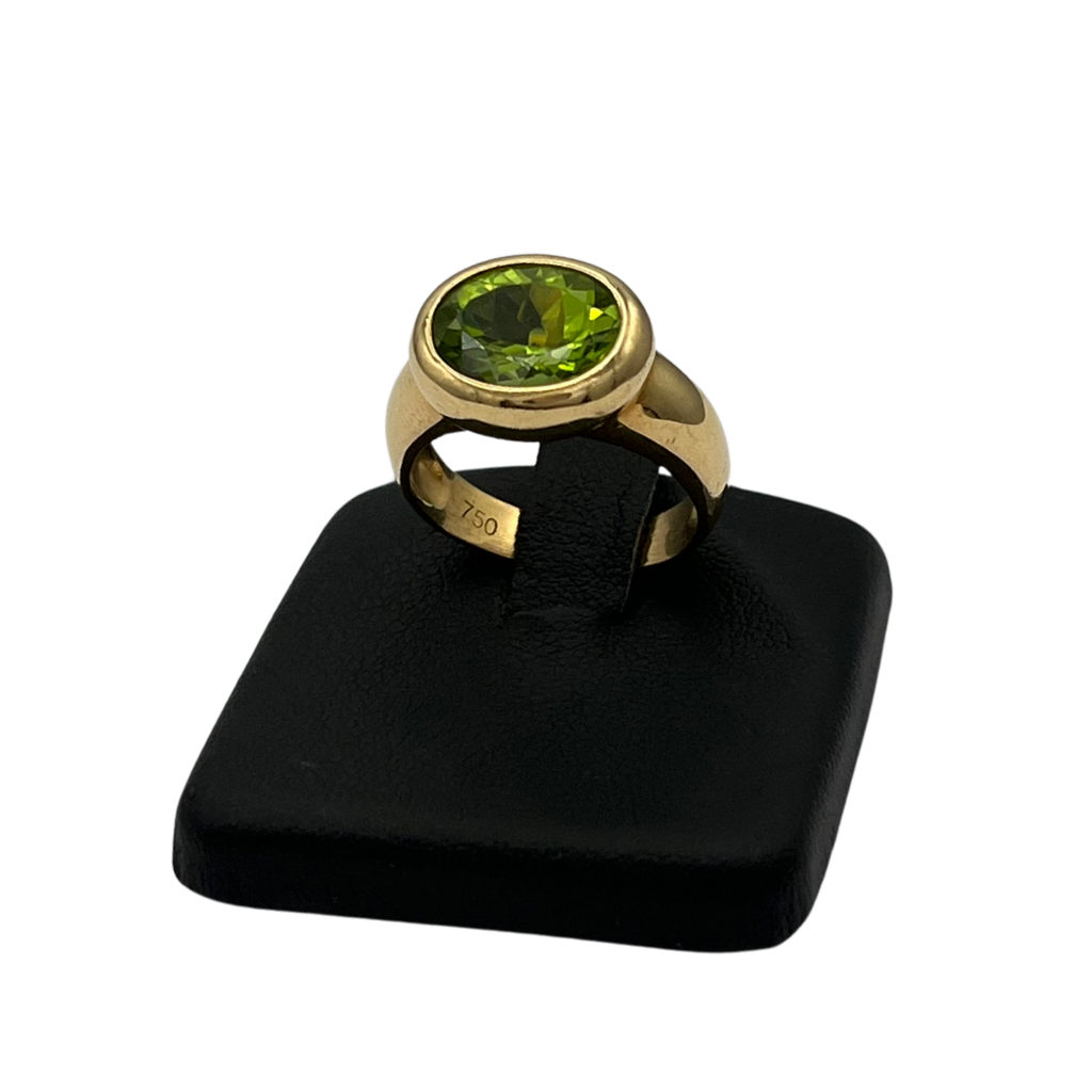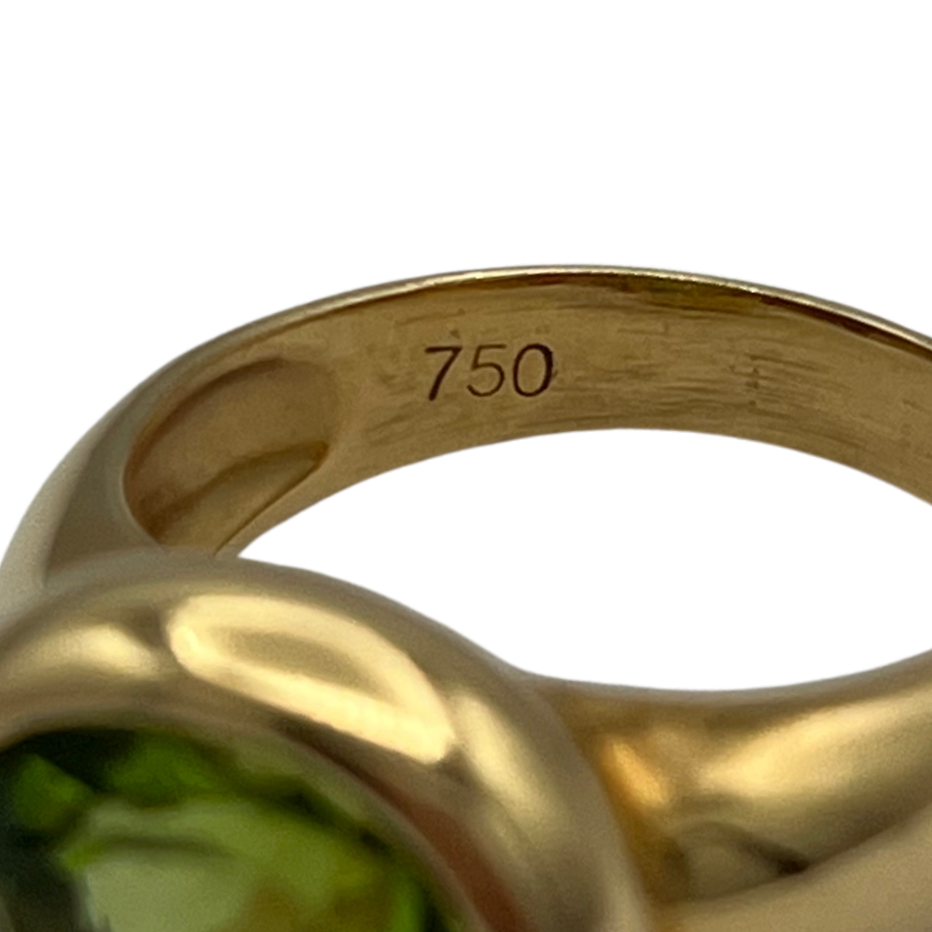 Gorgeous east-west peridot bezel set in 18k yellow gold with a high polish finish. Peridot has abrasion from light wear.