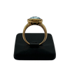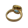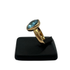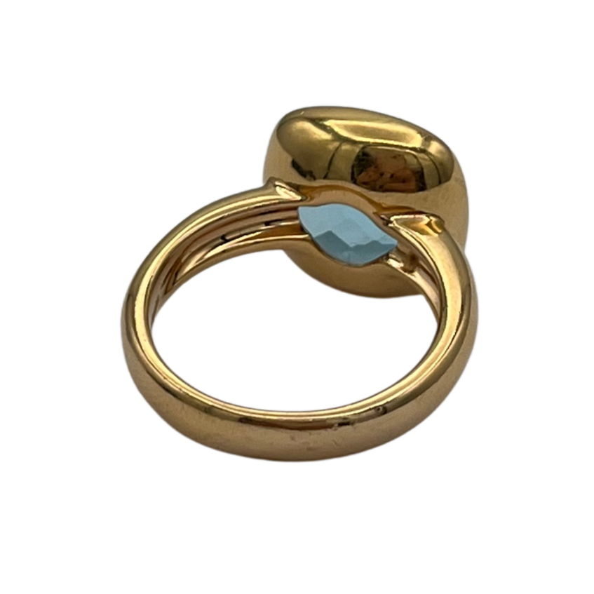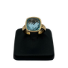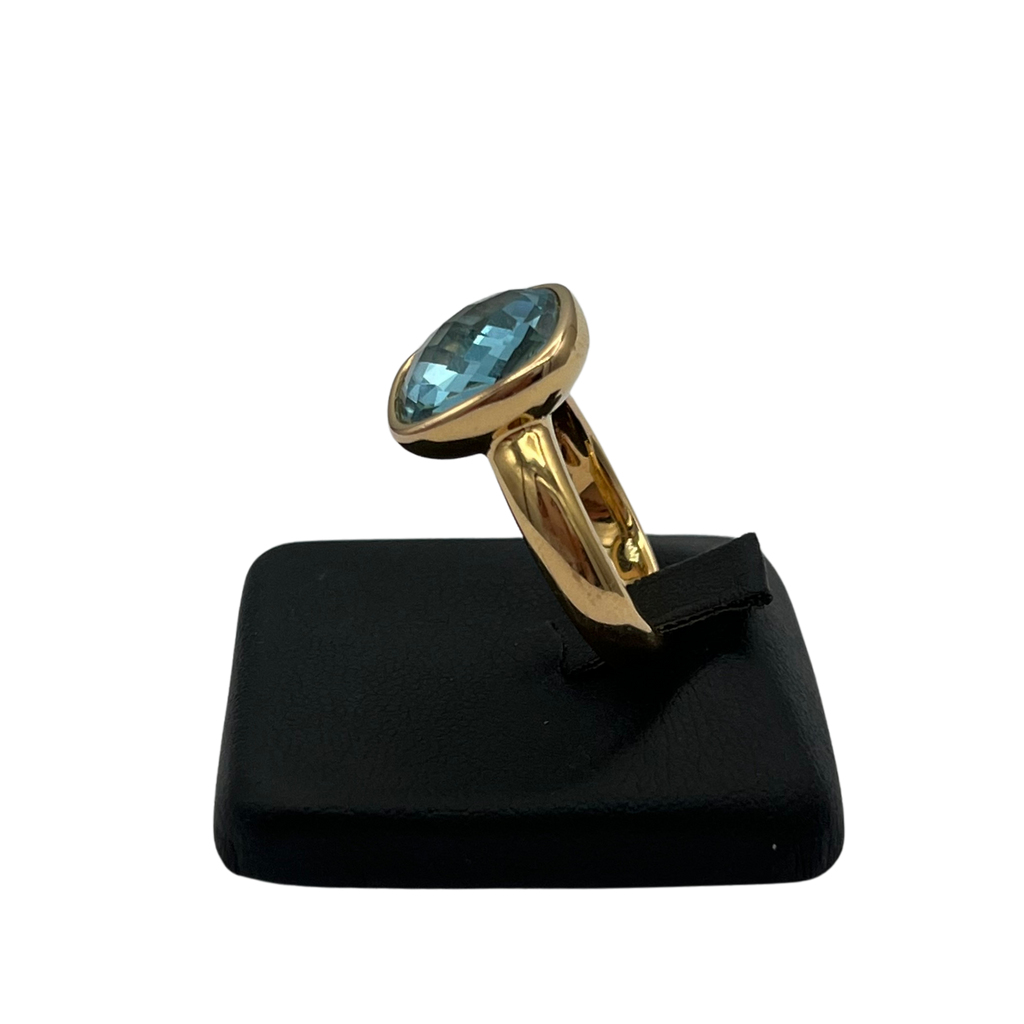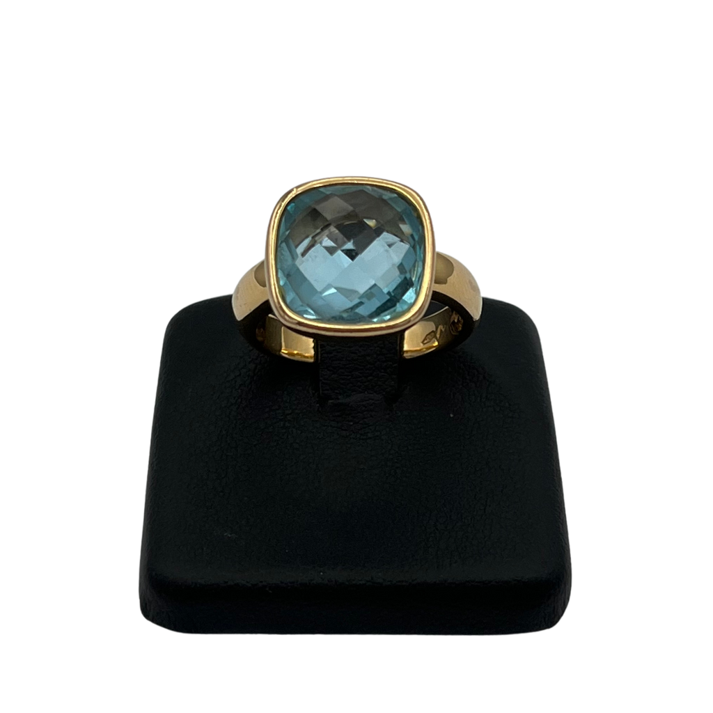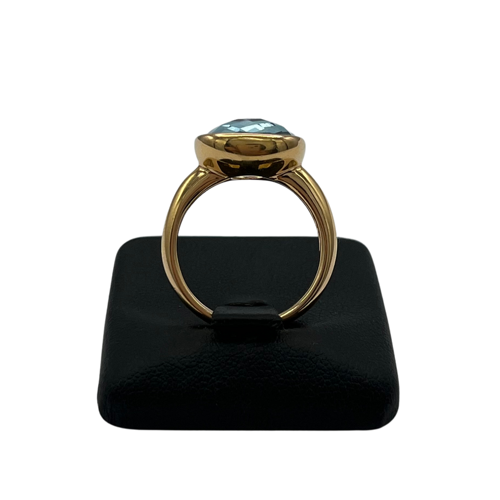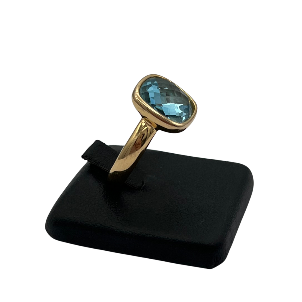 Vintage Italian ring featuring a checkerboard faceted blue topaz stone bezel set on a high polish 18k yellow gold band.