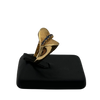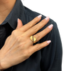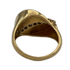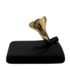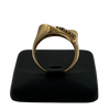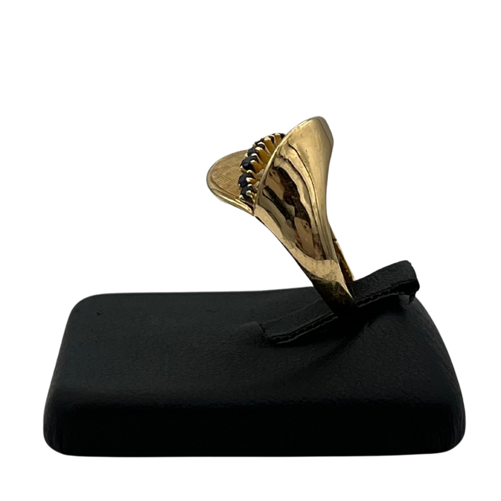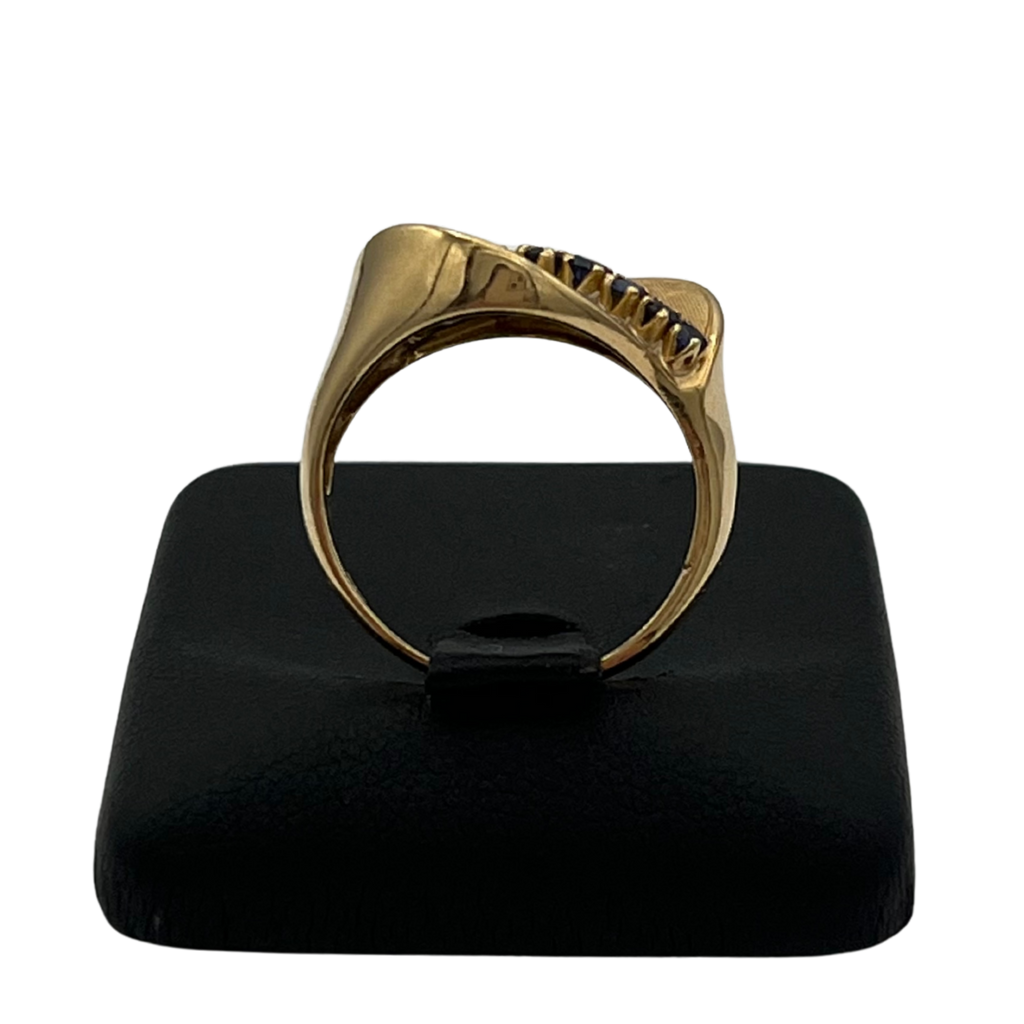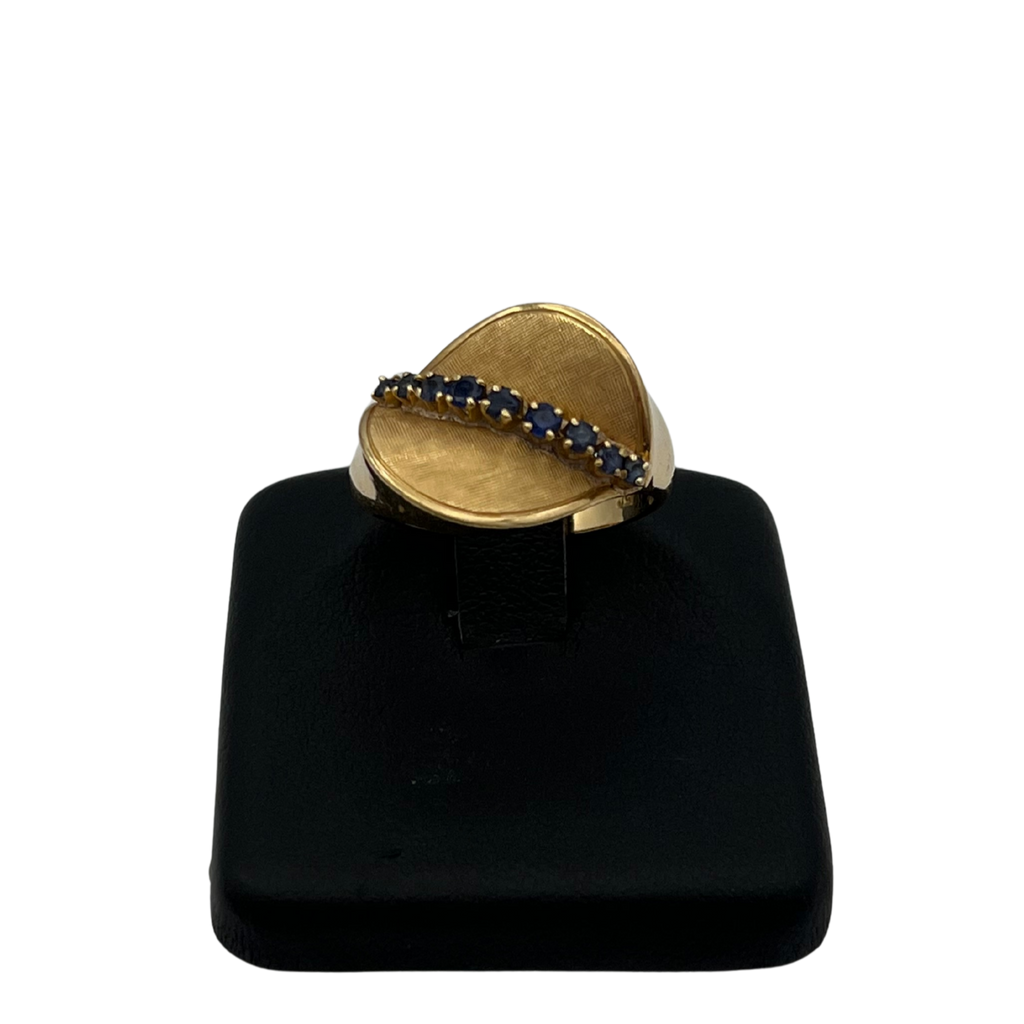 Vintage Italian 18k yellow gold ring in an asymmetrical curved design with a graduated line of sapphires running through it and a contrasting high polish and cross-hatch brushed finish.