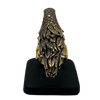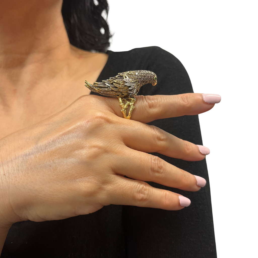 Truly a statement ring, this incredibly detailed parrot is pavé set with diamonds, and is perched on a textured abstract split shank 18k yellow gold band.