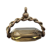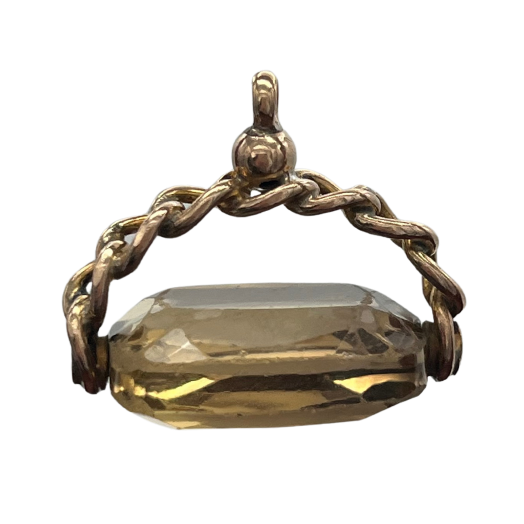 Antique fob pendant with a 9k rose gold chain motif fob pendant featuring a rotating faceted smoky quartz stone. The smoky quartz has significant visible abrasion because of the age of the piece.