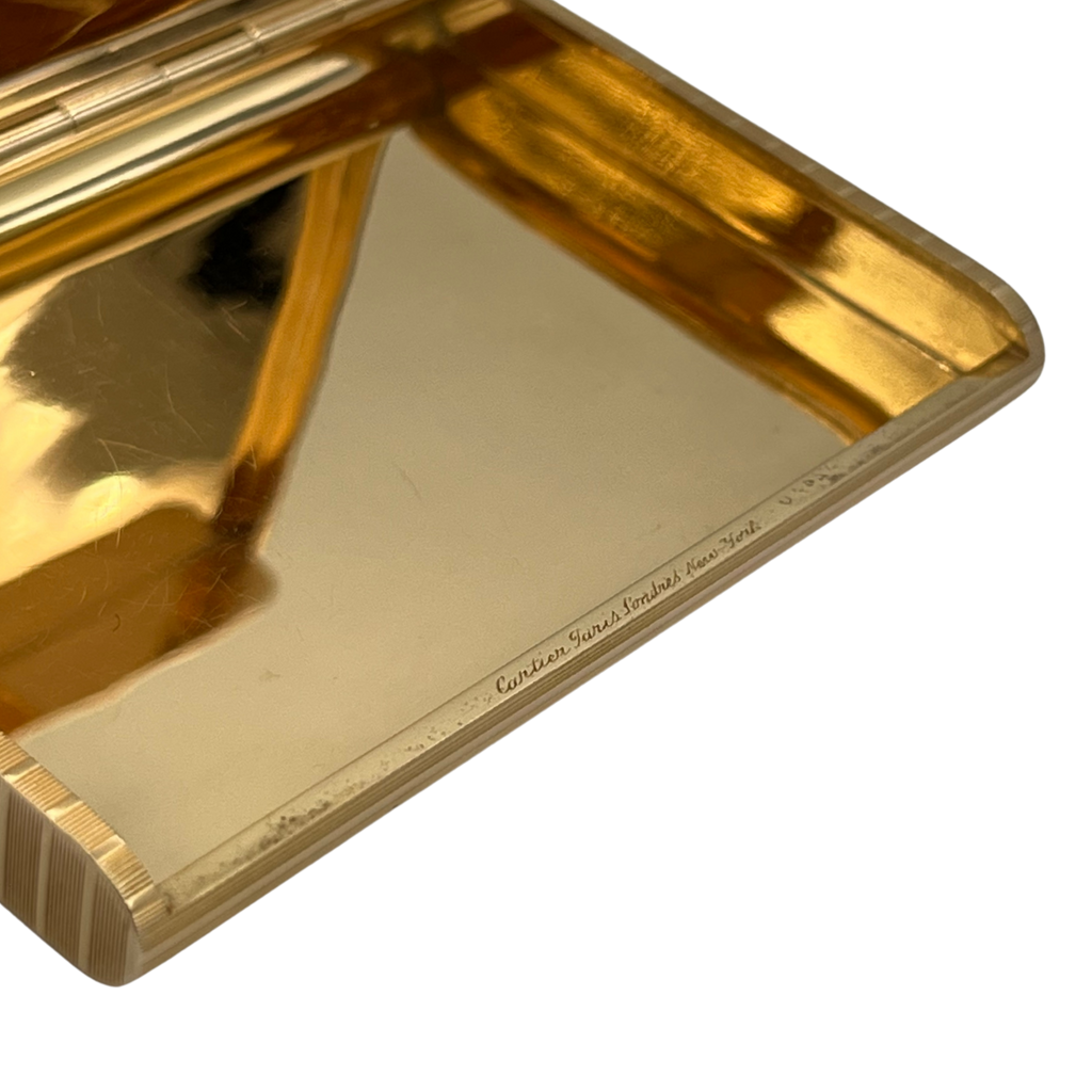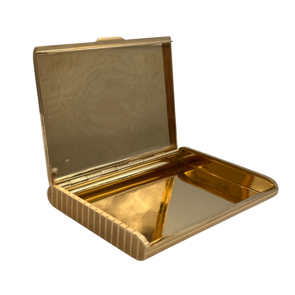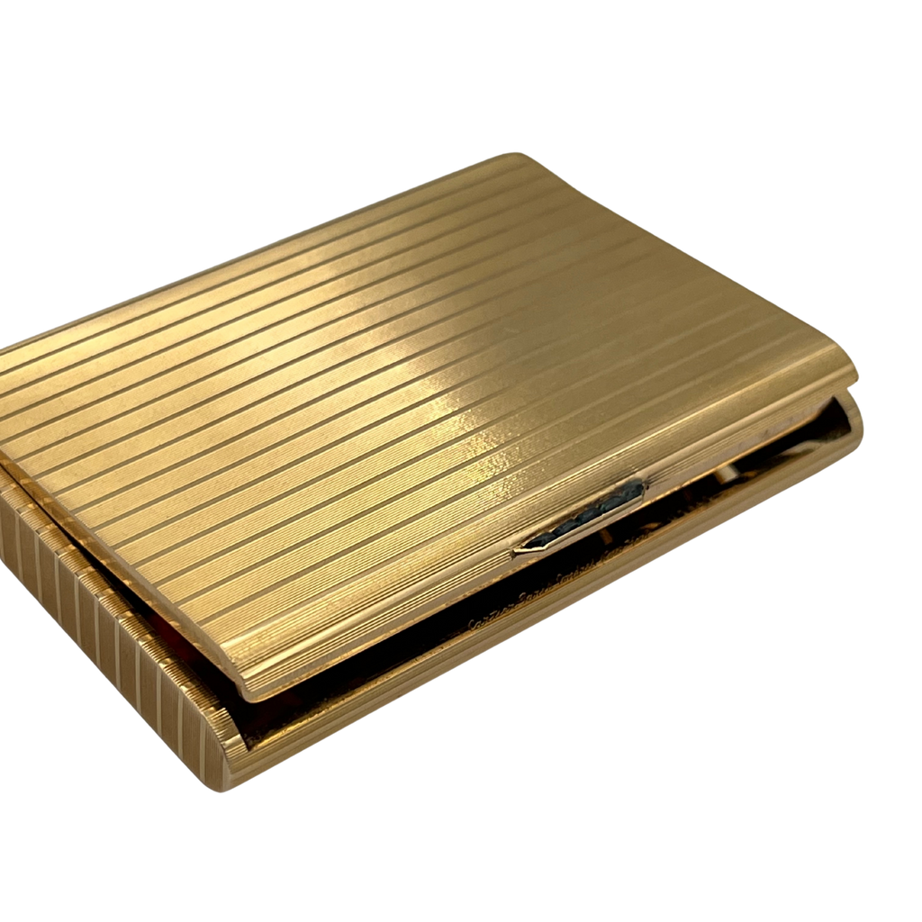 Vintage signed Cartier 18k yellow gold hinged cigarette case with linear design and thumbpiece set with calibré-cut sapphires. Interior of the case has Parisian eagle's head hallmarks.
